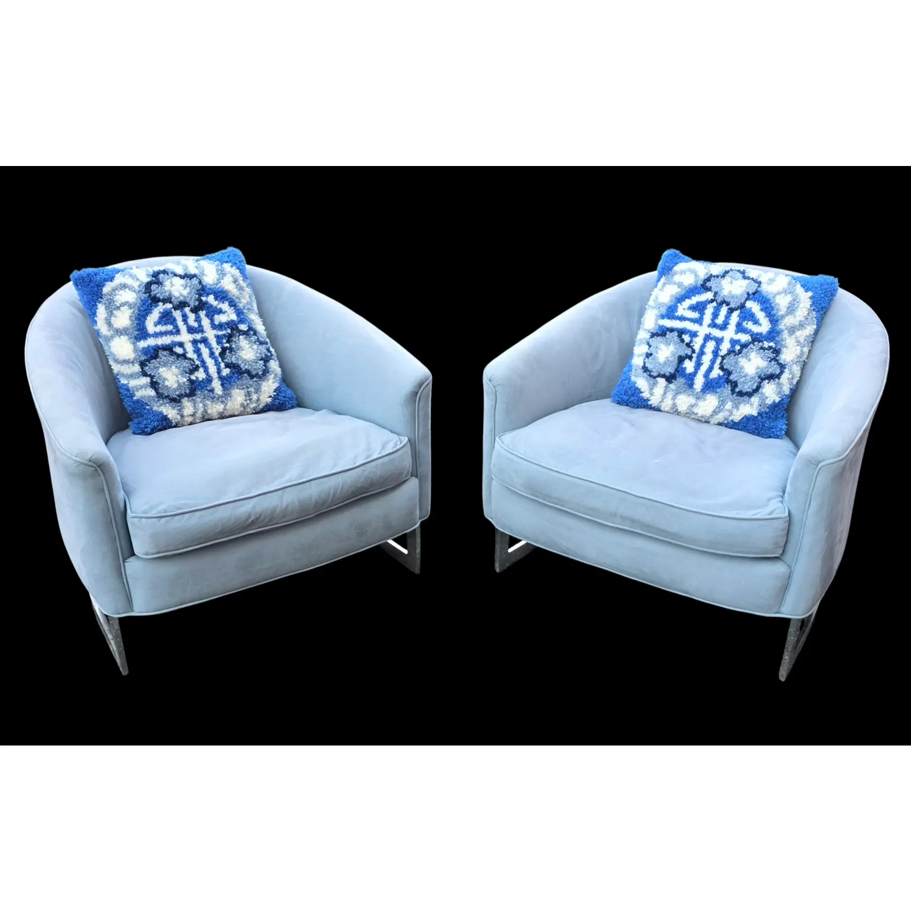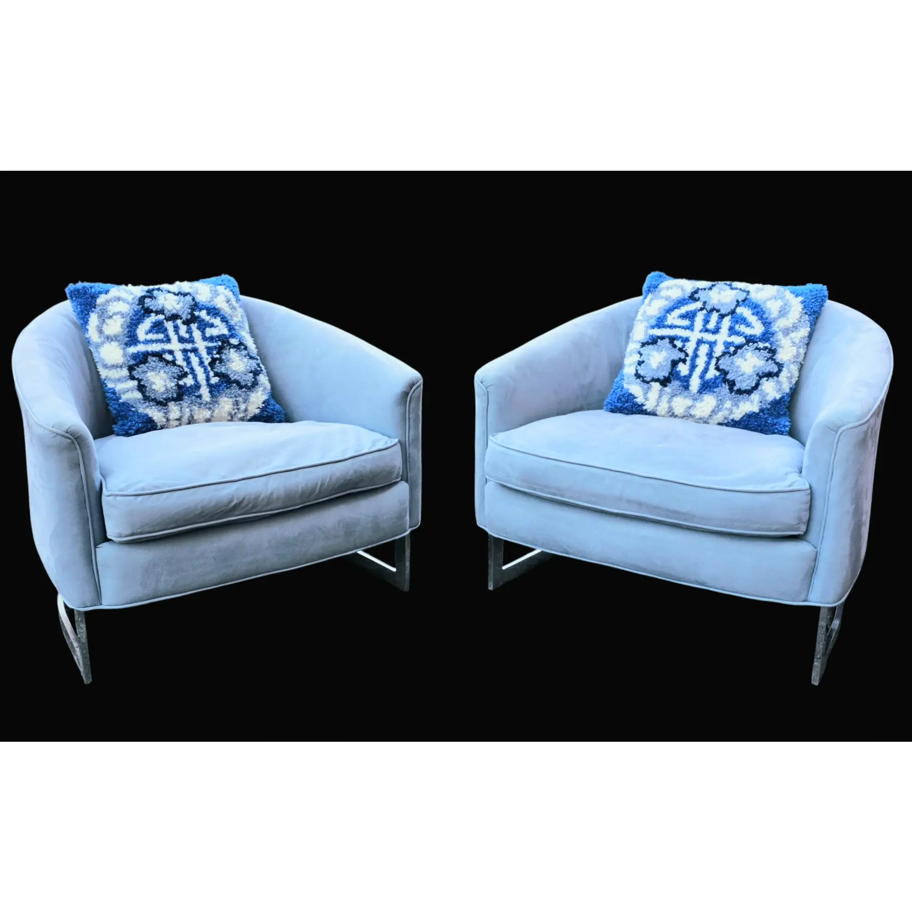 This Pair of Mid-Century chrome strap barrel lounge chairs are beautiful tub form seating pieces with polished chrome sled-style bases. The chairs have been reupholstered at some point in a pale blue, velvety fabric. These chairs are inviting and composed, offering a balance of comfort and design — well suited for many upscale interiors and a range living spaces.