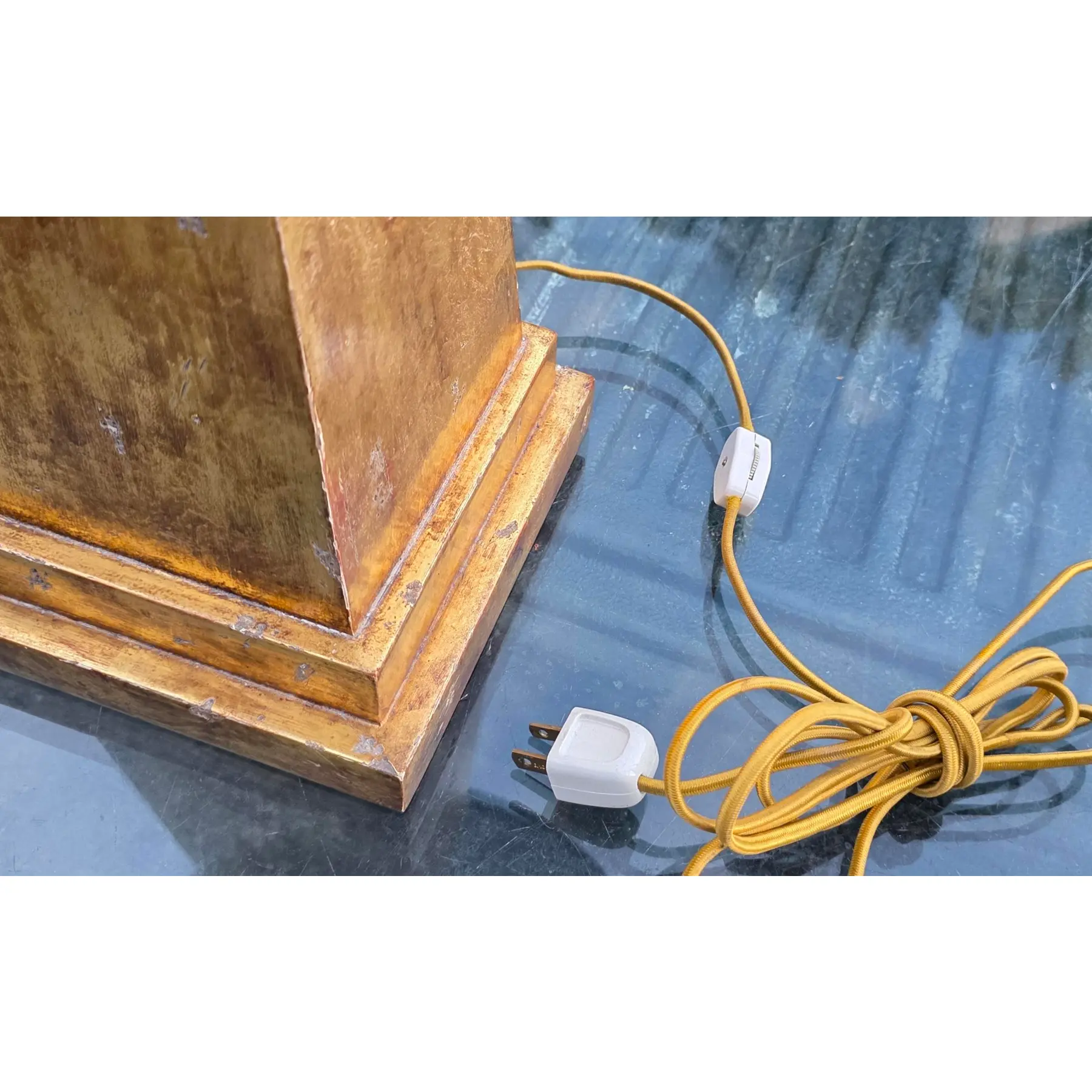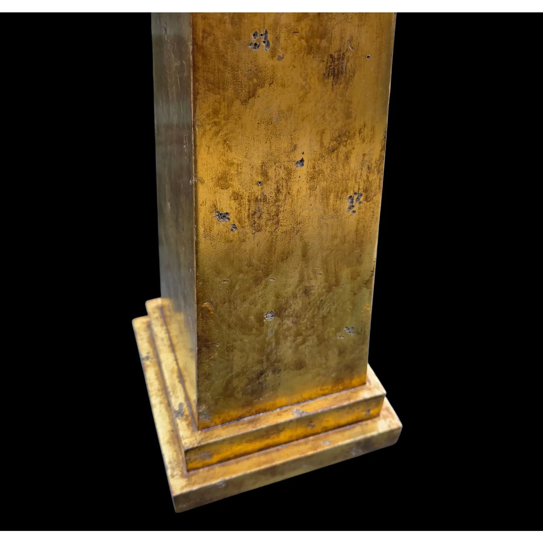 Hand-applied giltwood (gold leaf) finish with a purposefully distressed patina