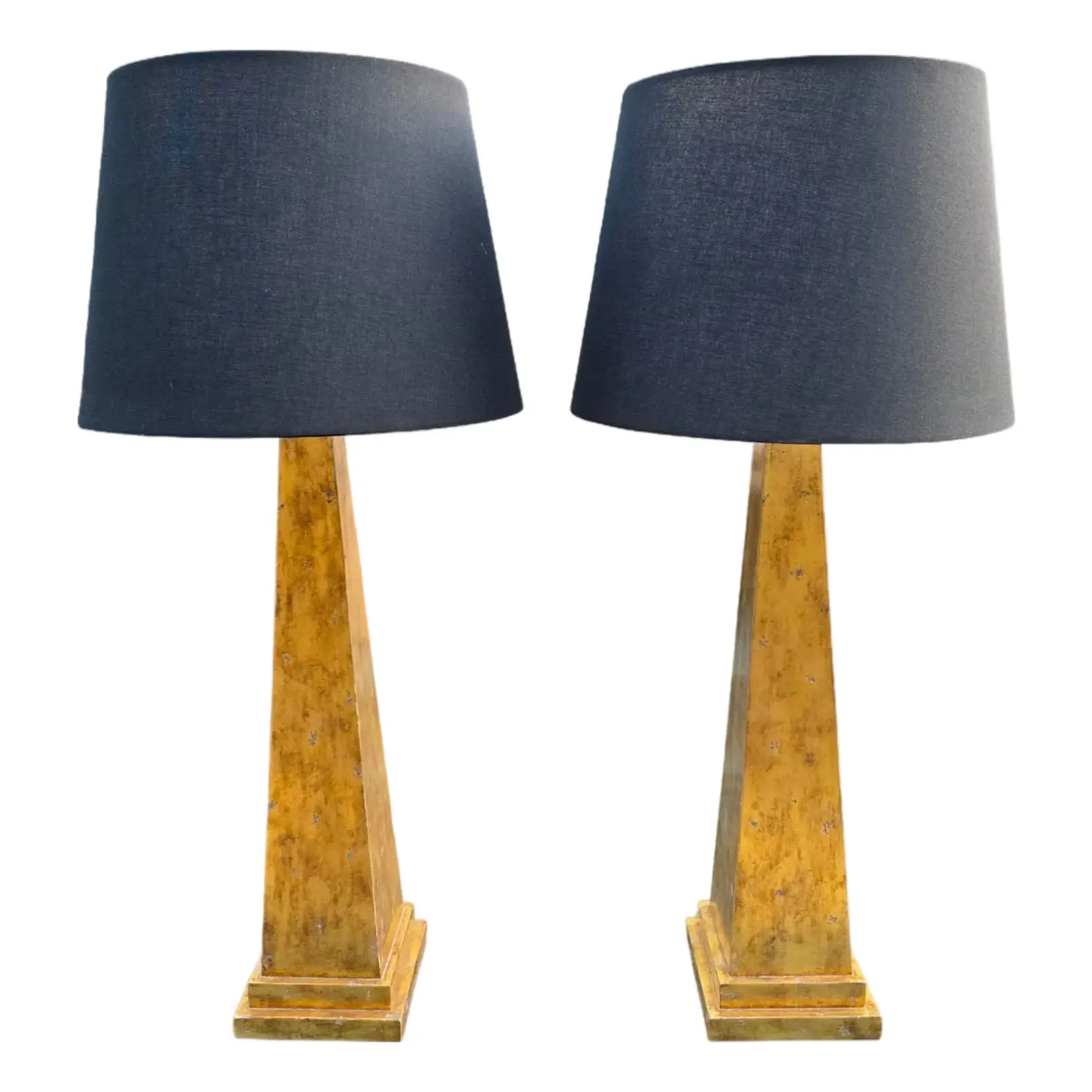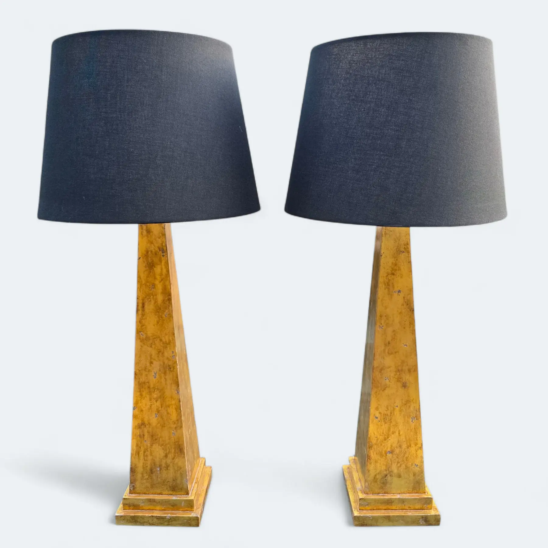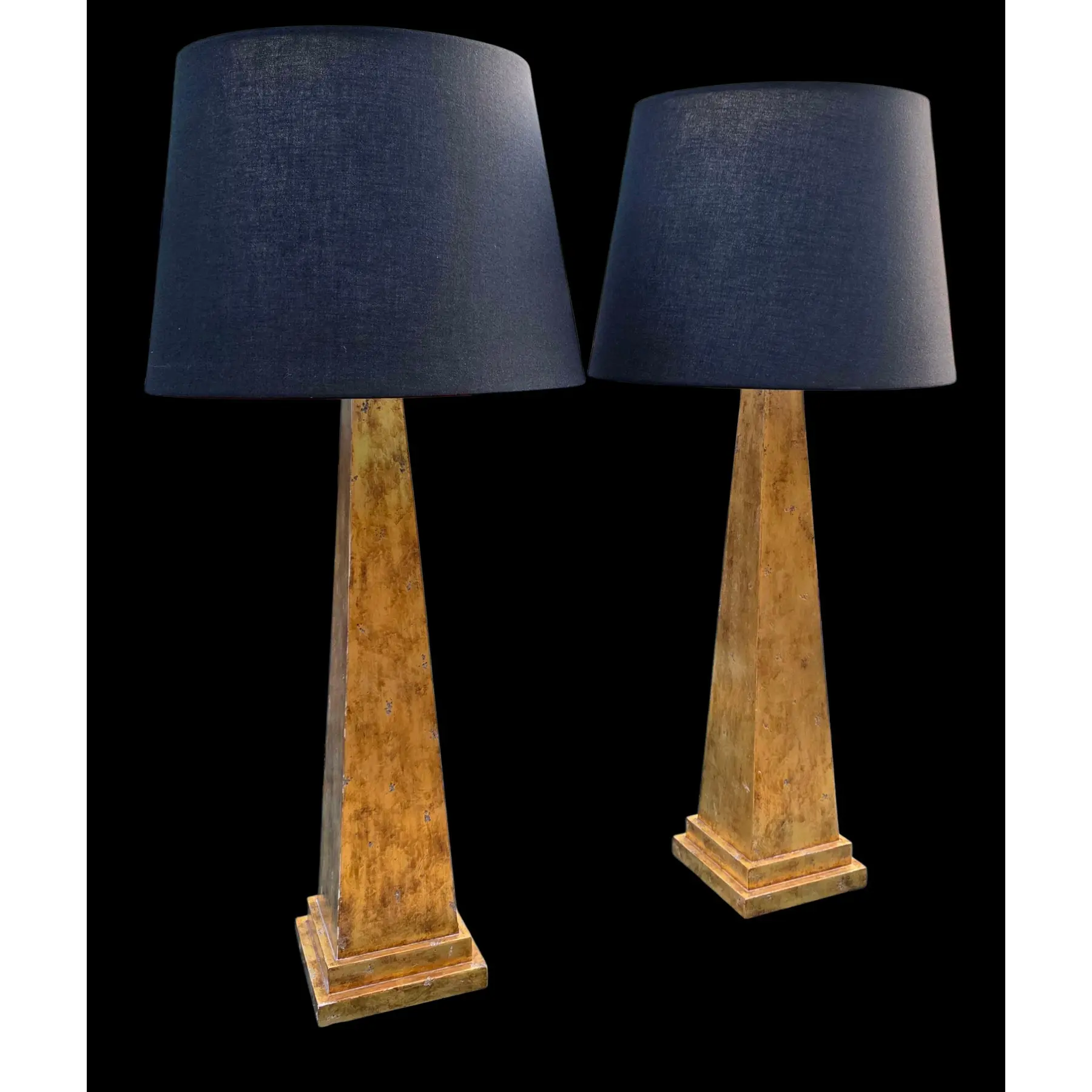 This Pair of Nancy Corzine Distressed Giltwood Obelisk Lamps is a highly sought-after set of neoclassically inspired accent pieces that embodies elegance and modern drama with timeless sophistication.