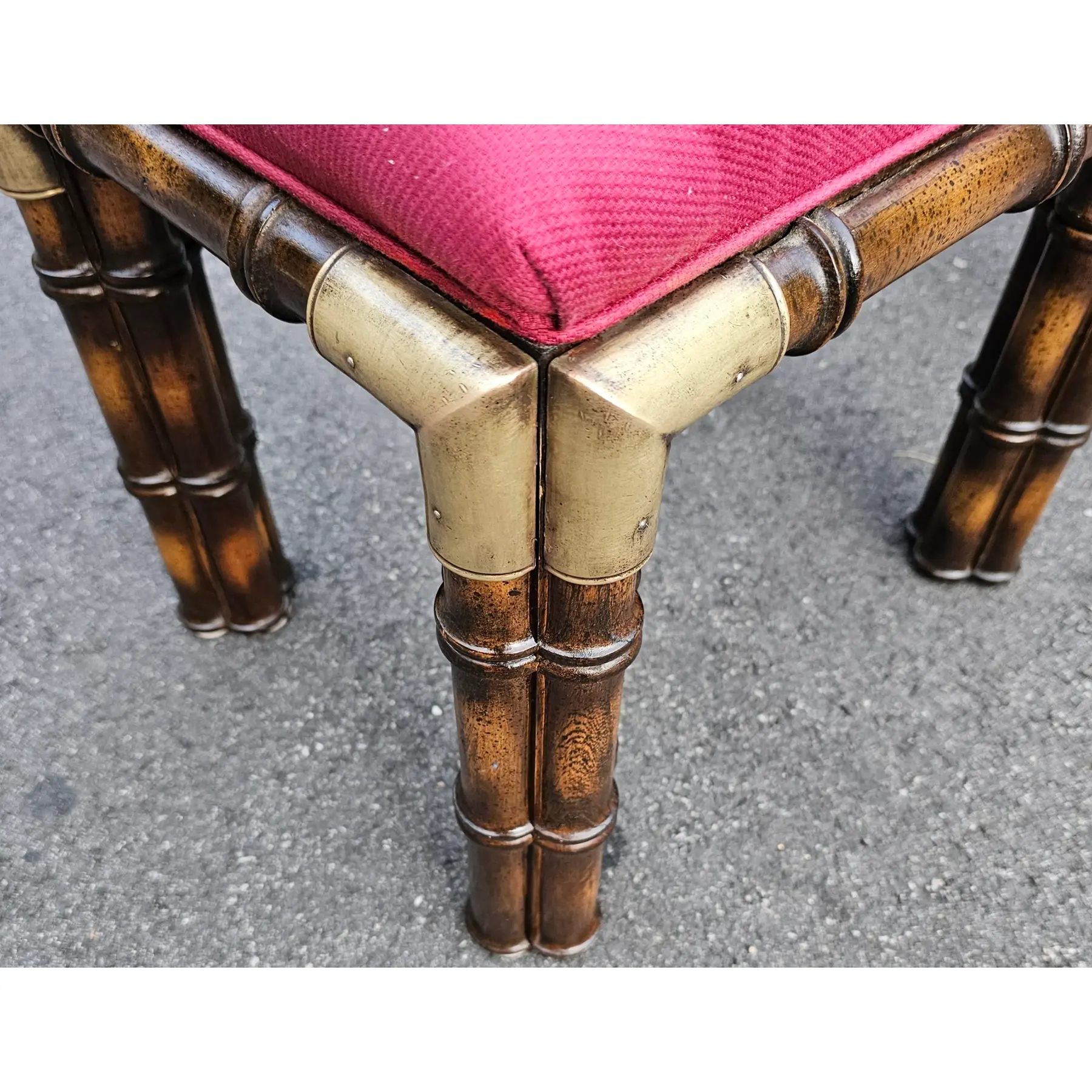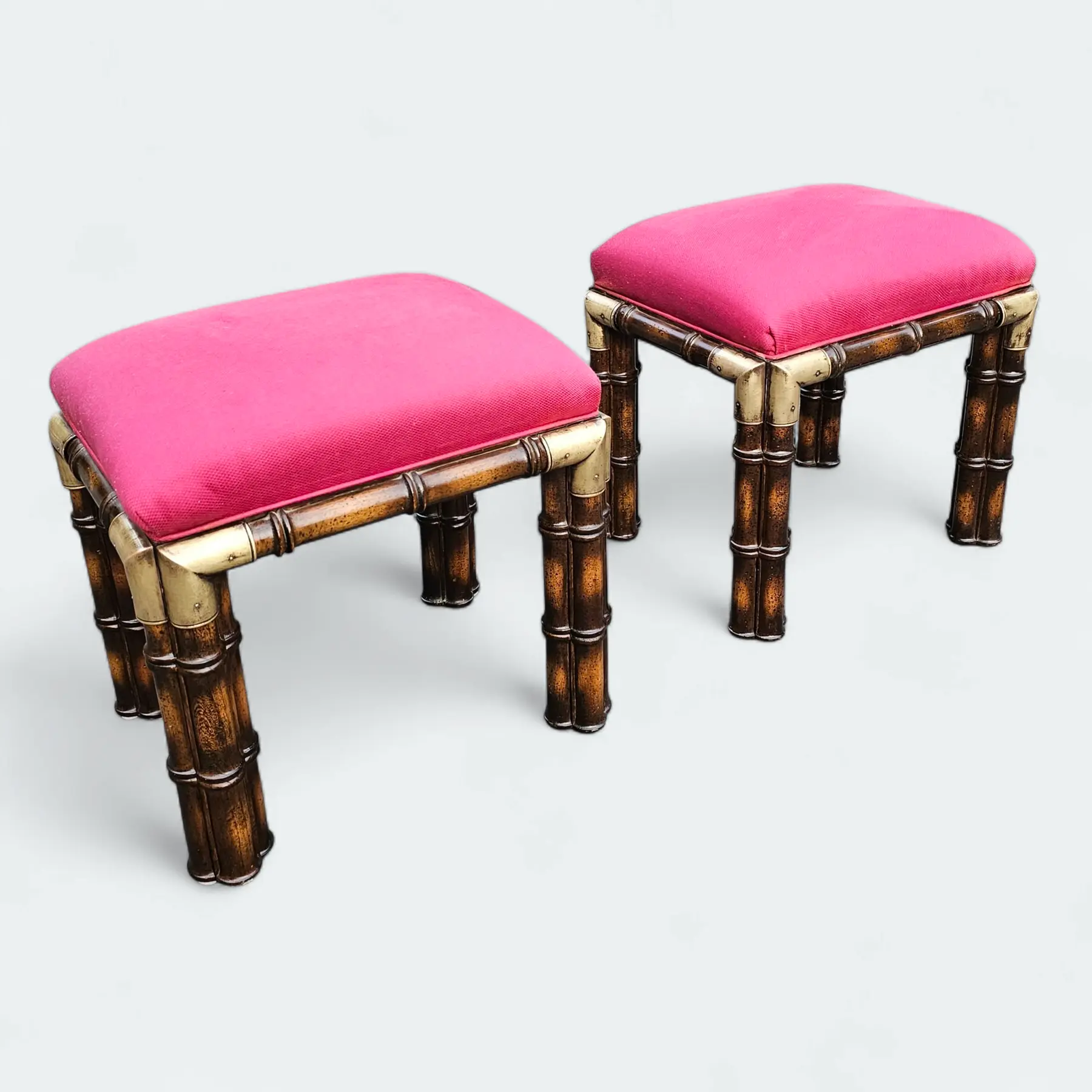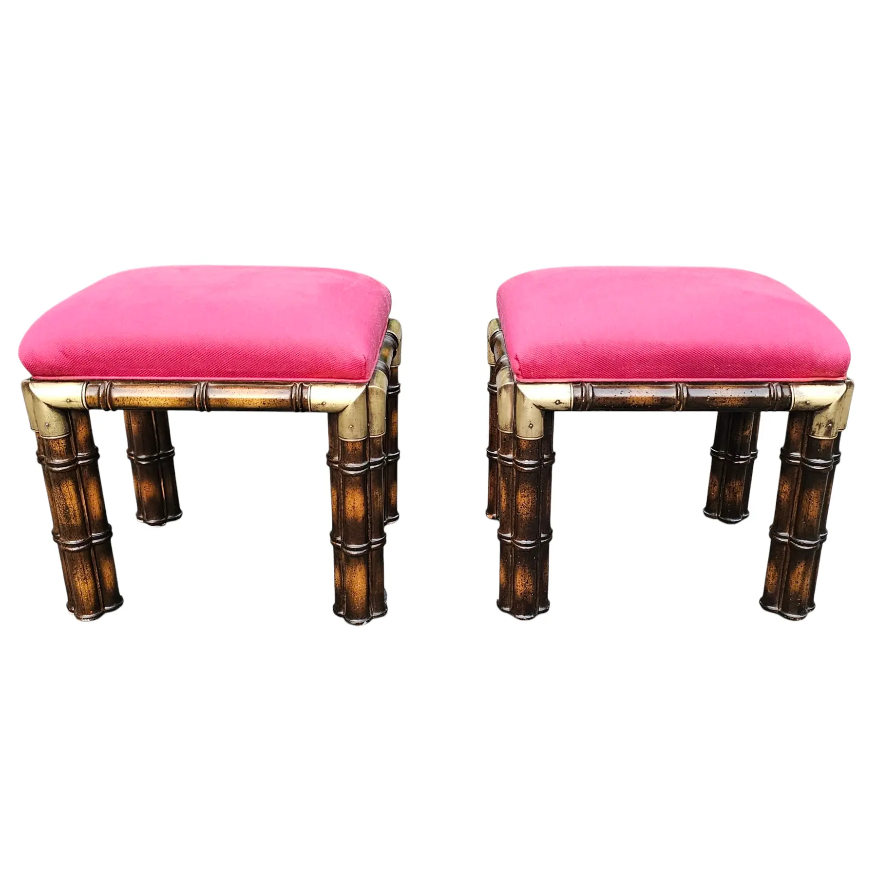 This Pair of Vintage Hollywood Regency Faux Bamboo and Brass Benches is glamorous and sophisticated with bold and dramatic pink visual highlights.