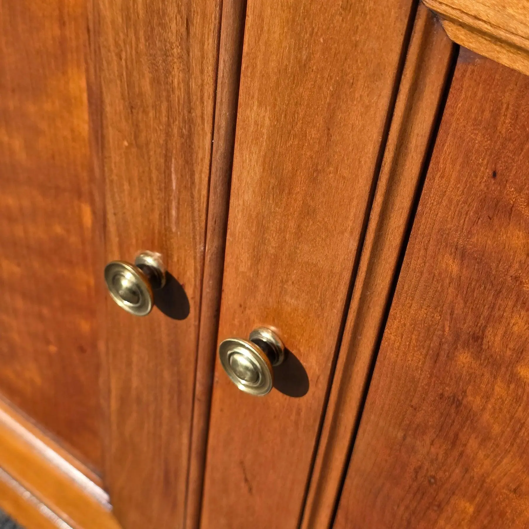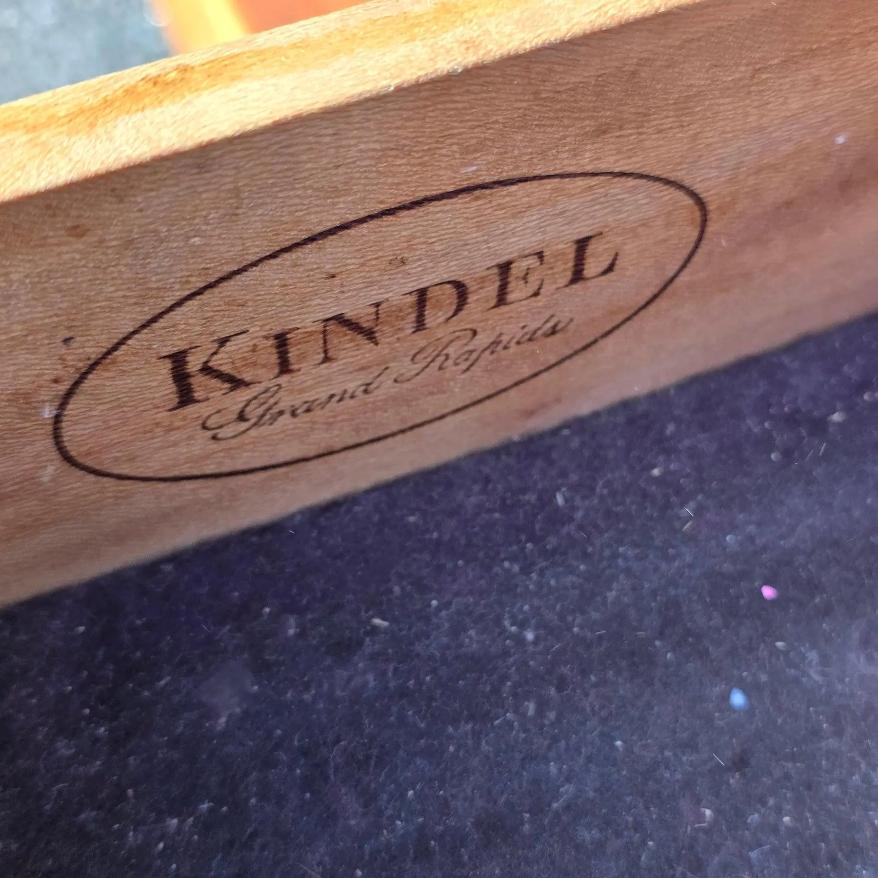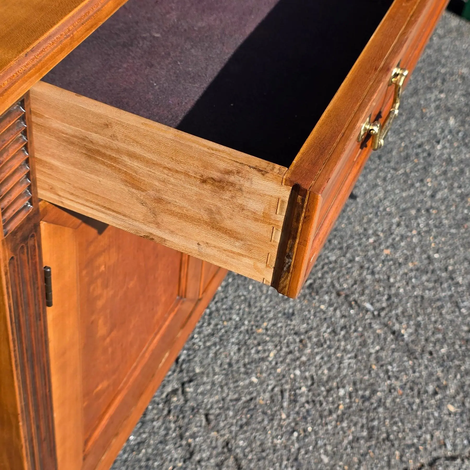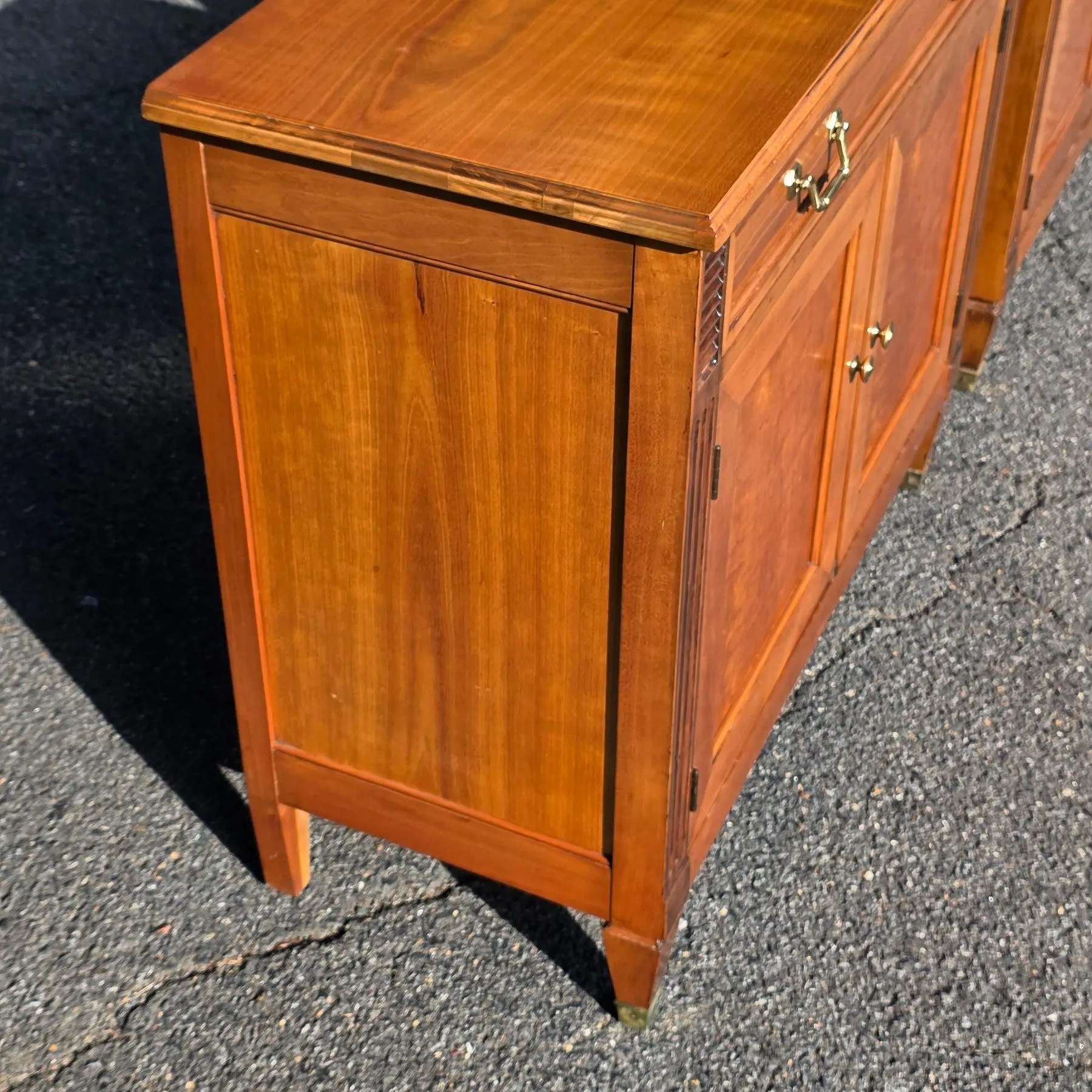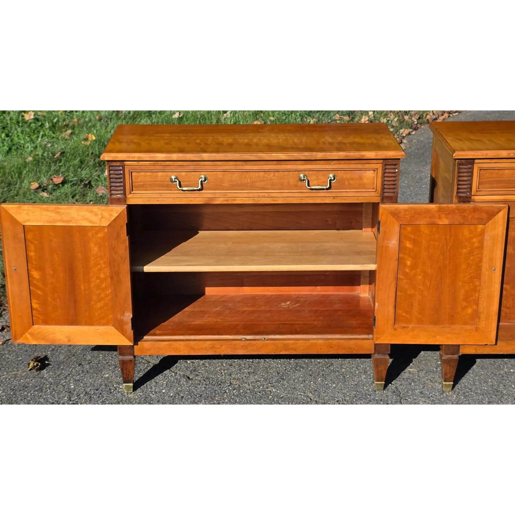 These Vintage French Regency-style servers from Kindel Furniture are both stylish and functional. This stately server, made of superb handcrafted cherry wood, is accented by reeded pilasters that add symmetry, enhance its aesthetic appeal, and highlight its wonderful carpentry. The server has a roomy sliding top drawer and a double-door lower cabinet that opens to show a large storage compartment with an adjustable shelf. Also has gilt-brass hardware, such as swan-neck drawer pulls and rounded cabinet knobs, and tapered legs that end in gilded brass sabots, which are hallmark of French Regency furniture. This wonderfully proportioned and authentic Kindel Furniture server can be easily positioned and used as an exquisite buffet in a dining room, sideboard in a stately entryway, or accent chest in other refined living spaces, where its presence is both commanding and sophisticated.