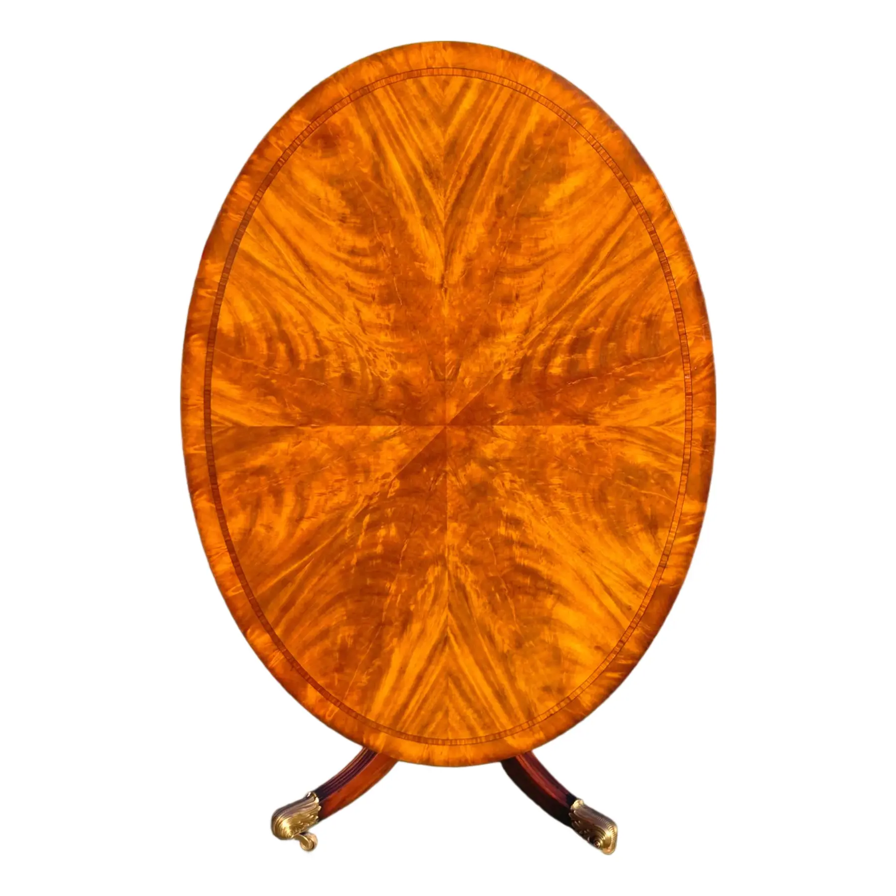 Generously scaled oval top constructed from flame mahogany wood and veneers with inlaid border