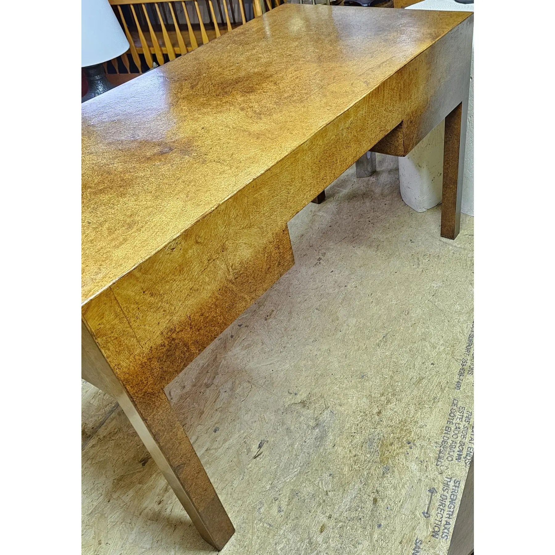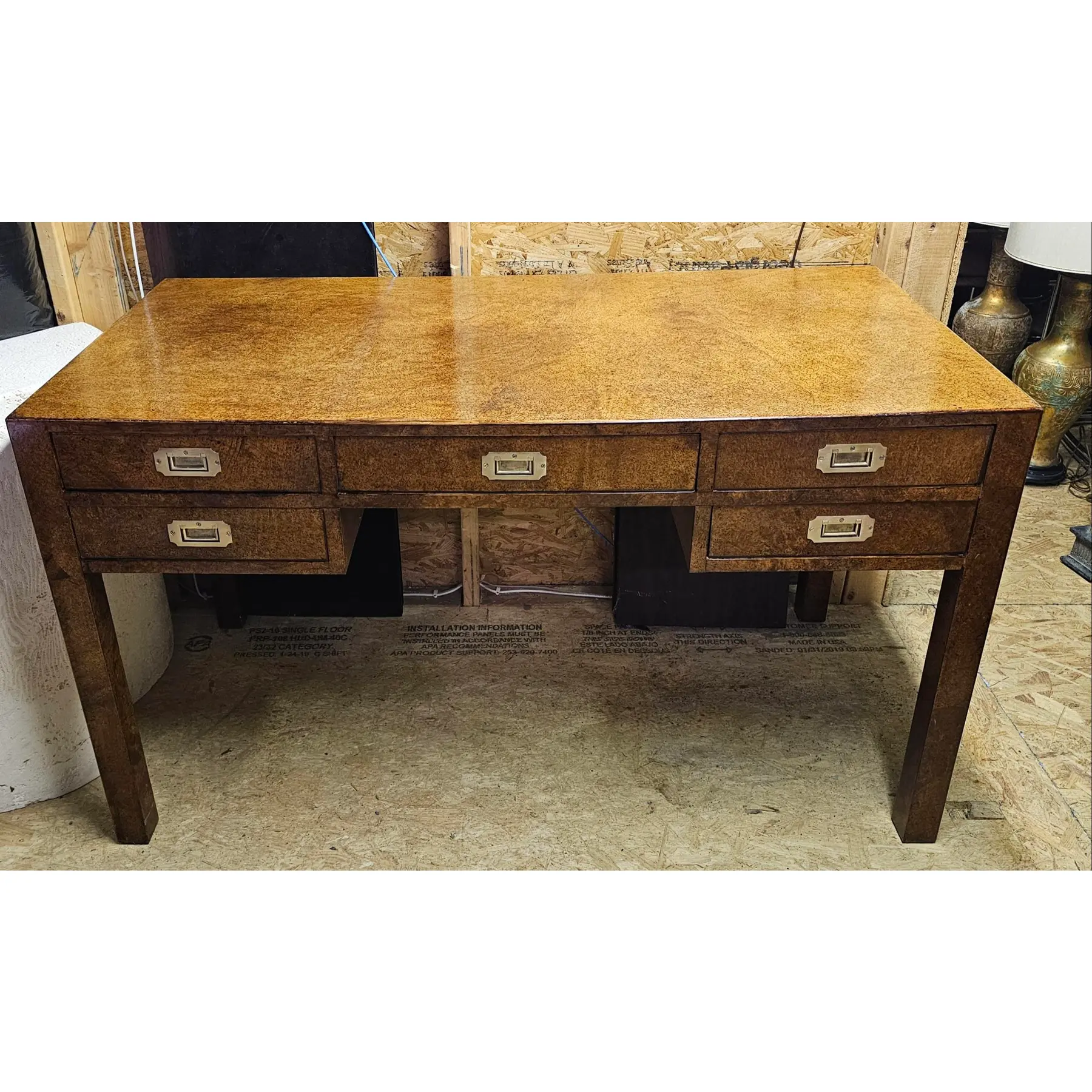 This Vintage Burlwood Campaign Style Writing Desk, inspired by the legacy of 19th-century British military campaign furniture is sleek and sophisticated.