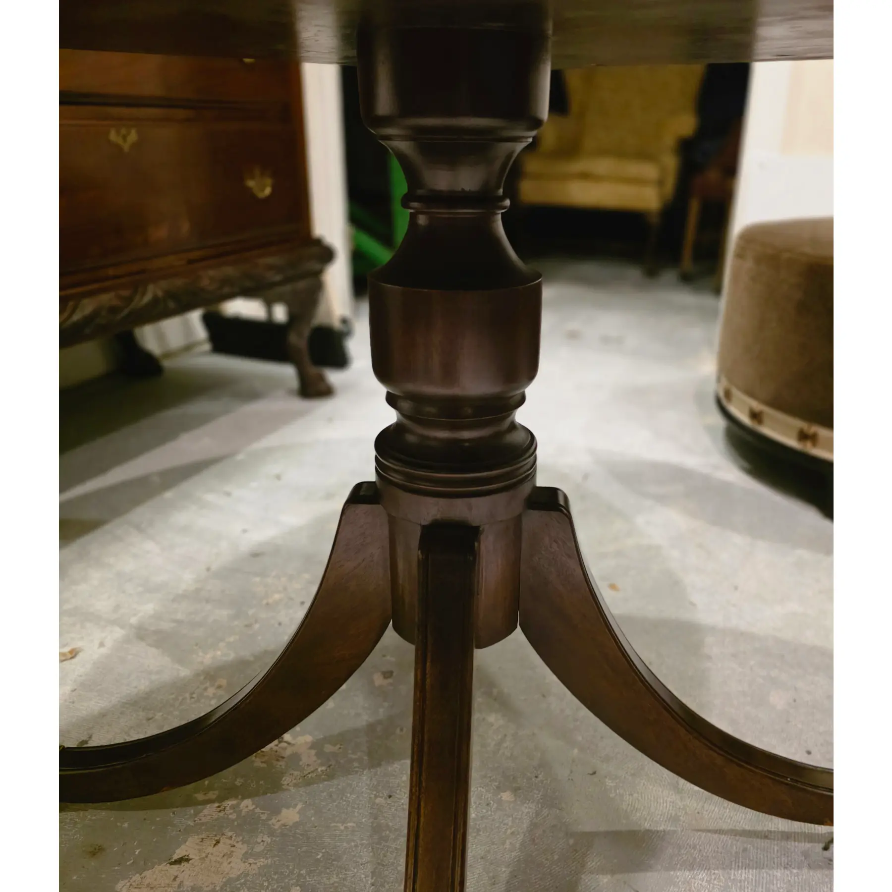 Sculptural central column pedastal base that transitions into four curved legs