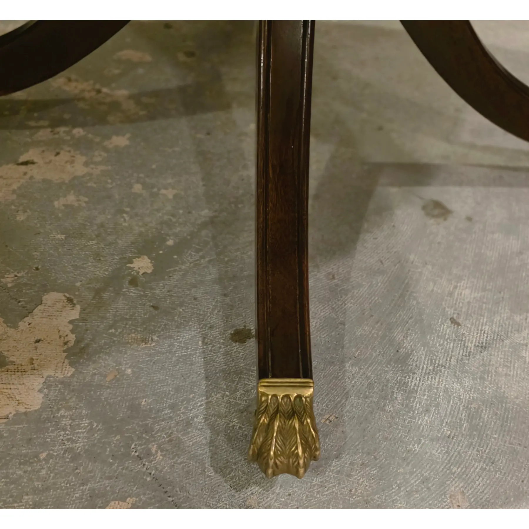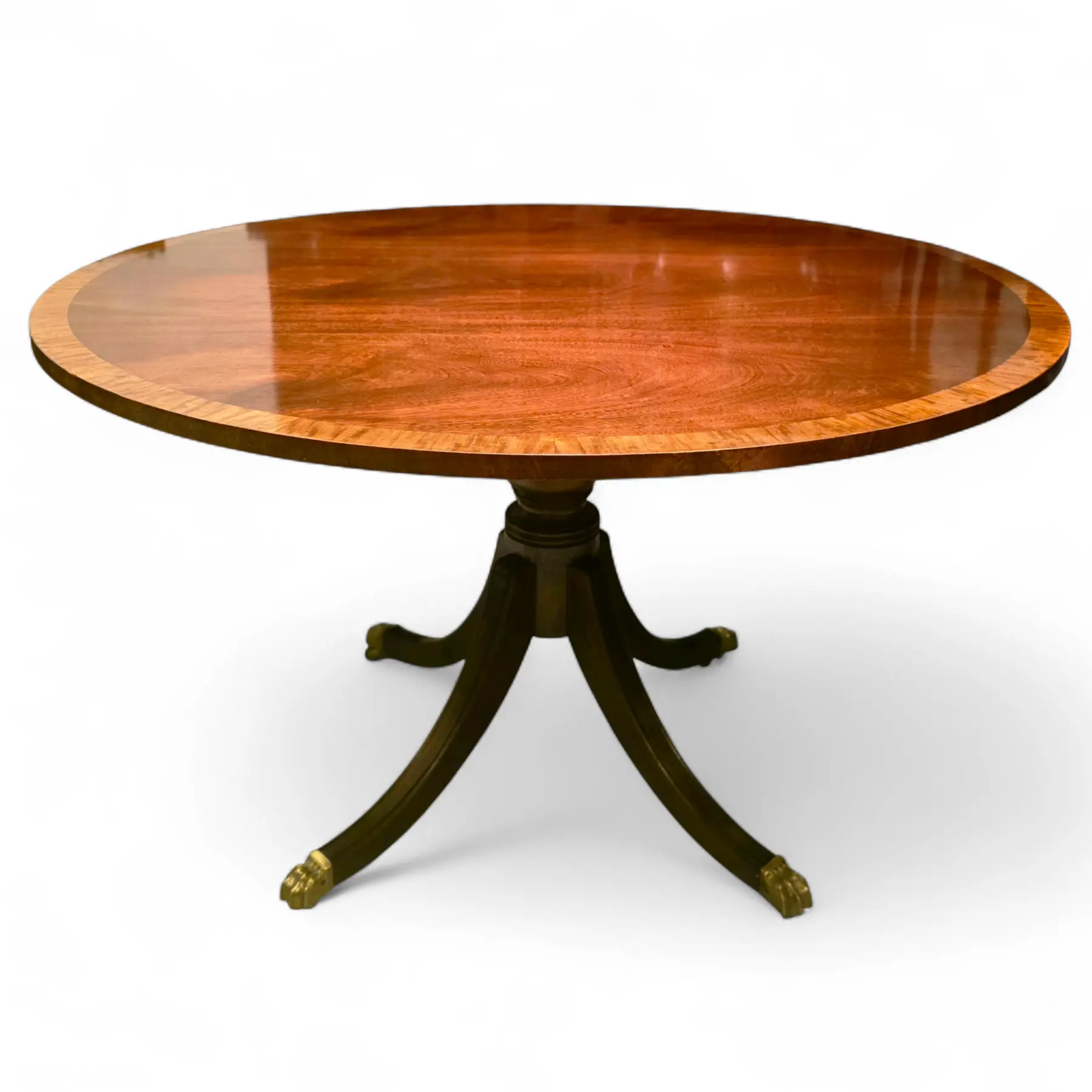 In good vintage condition with visible wear consistent with gentle age and use. Tabletop shows light surface wear, including fine scratches, minor scuffs, and subtle finish variations consistent with moderate use. Banded edge exhibits small areas of wear an slight finish thining. Base and legs show scattered wear, including minor scuffs and finish rubbing. Gilt metal paw feet show age-appropriate wear and patina.
