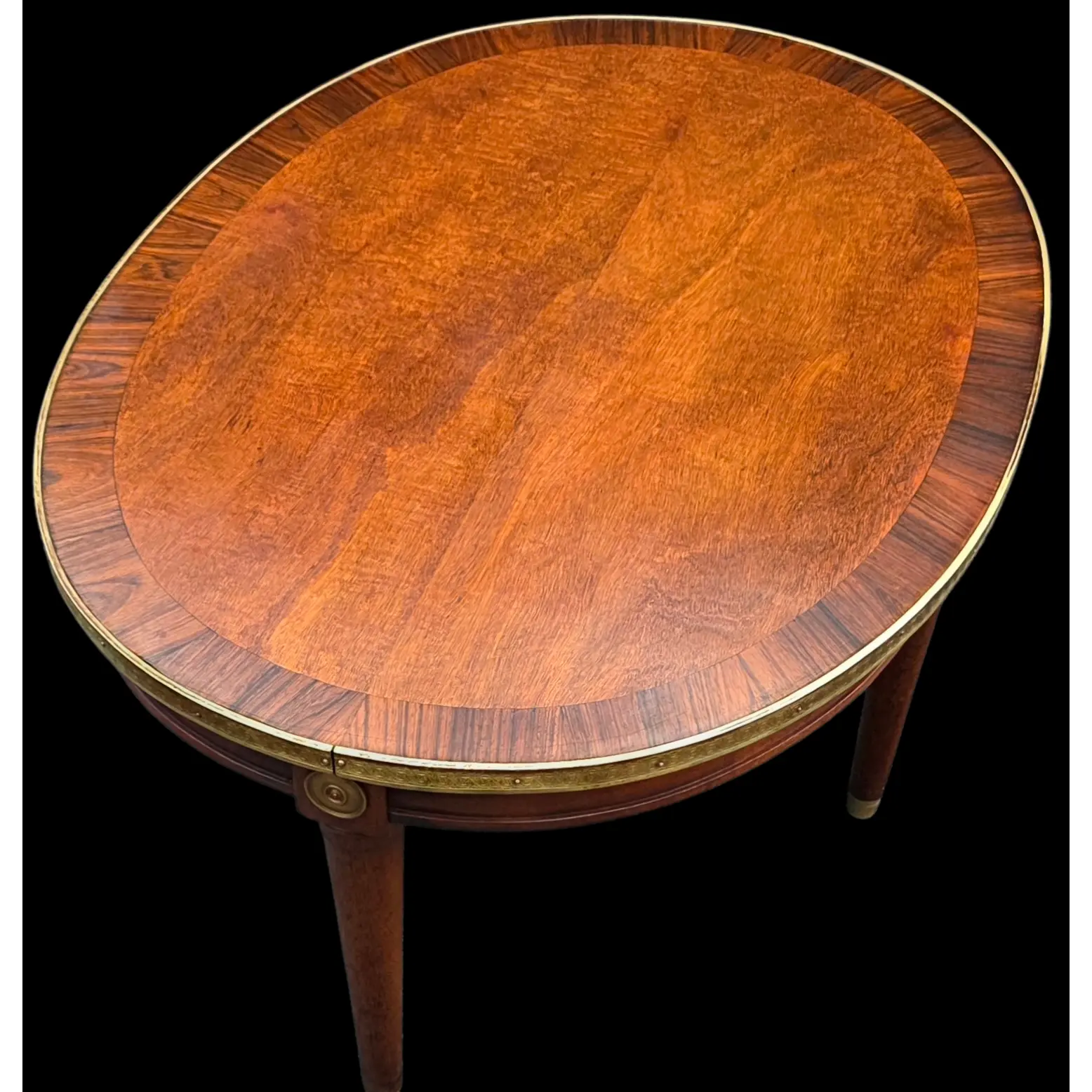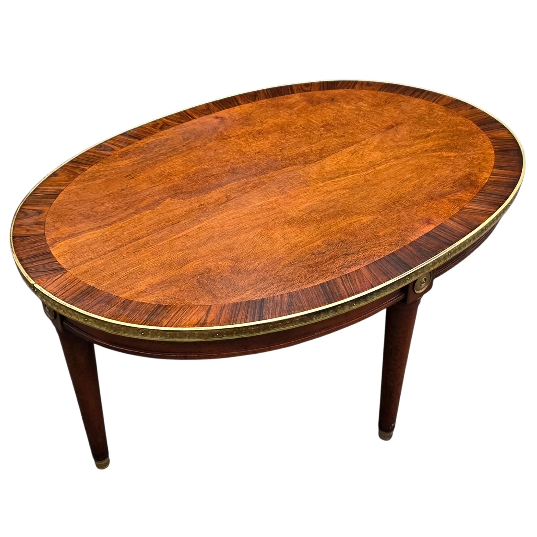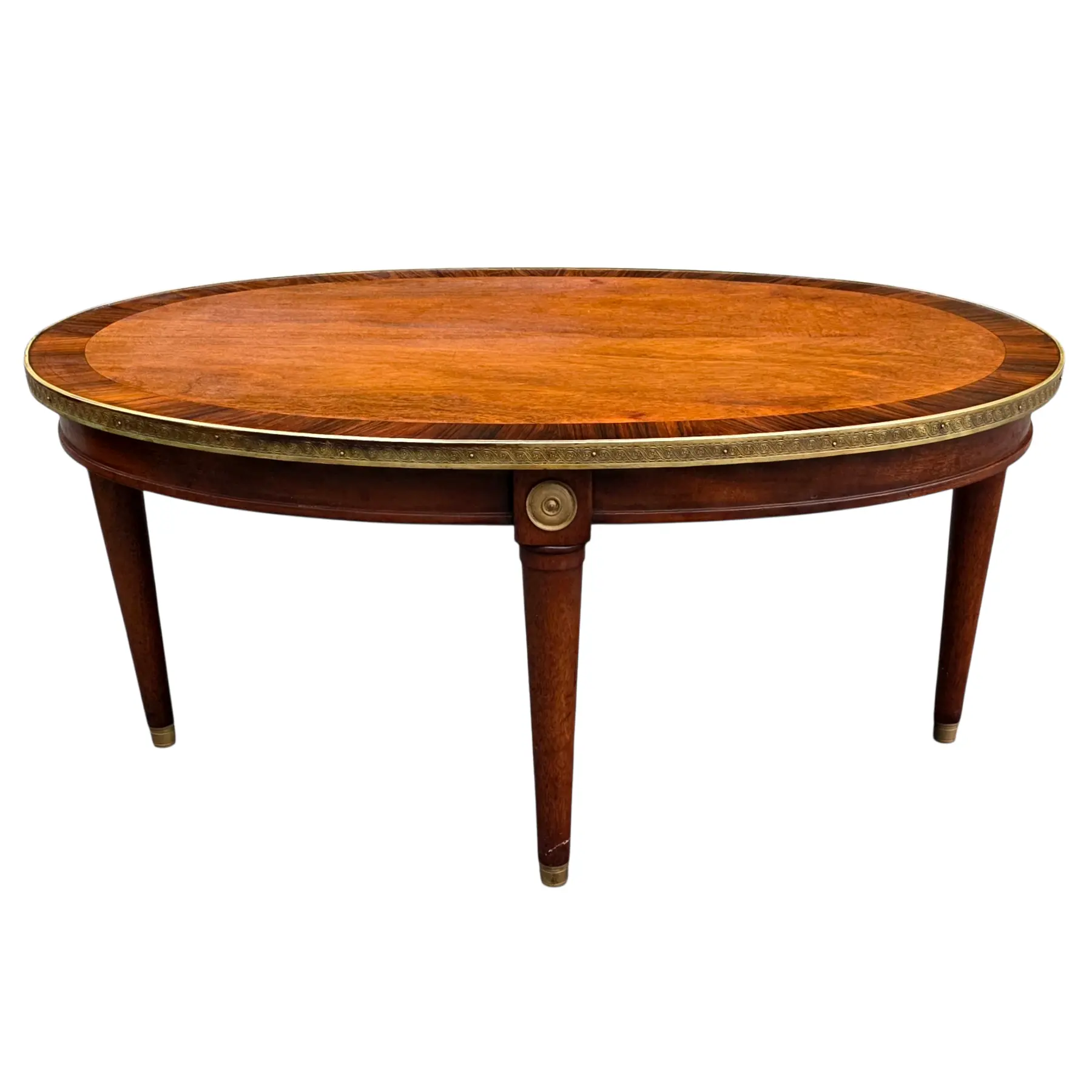 This Vintage French Louis XVI–style oval coffee table featuring a refined mixed-wood top framed by brass trim, is an elegant furnishing piece for a living room, formal or even informal seating space. It features a classical profile without excessive ornamentation and blends welll with various types of furnishing enough to elevate a wide range of interior design styles.