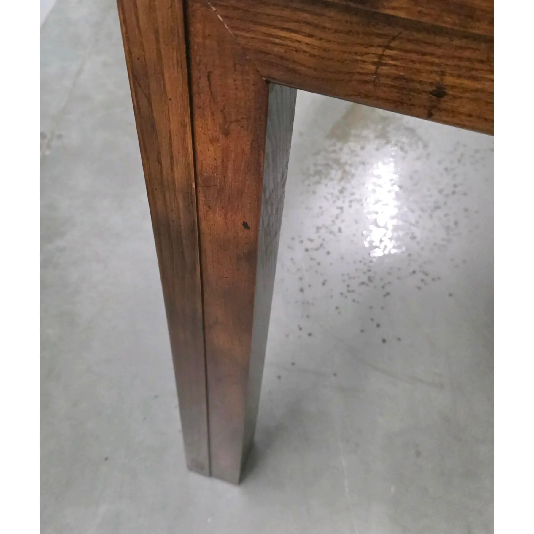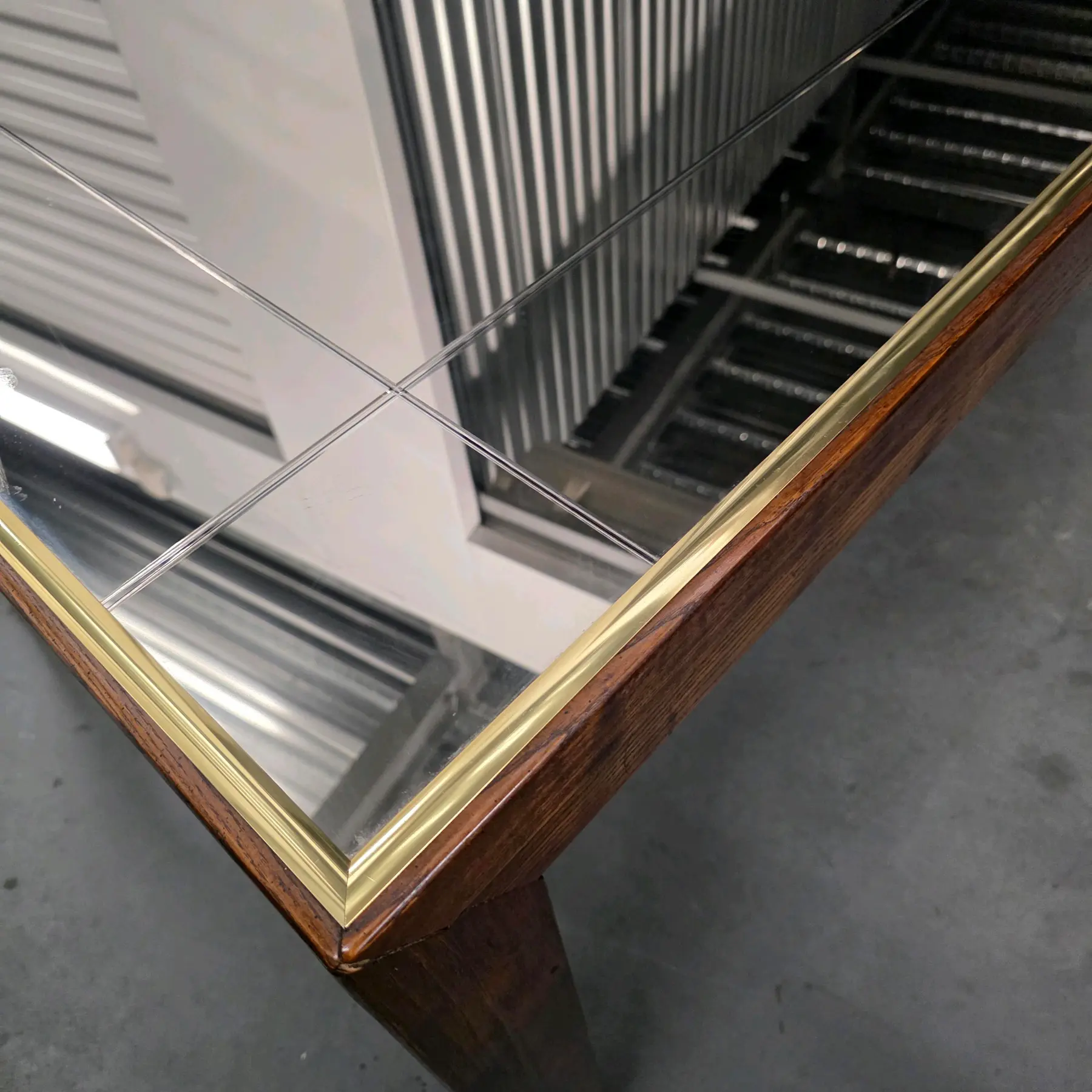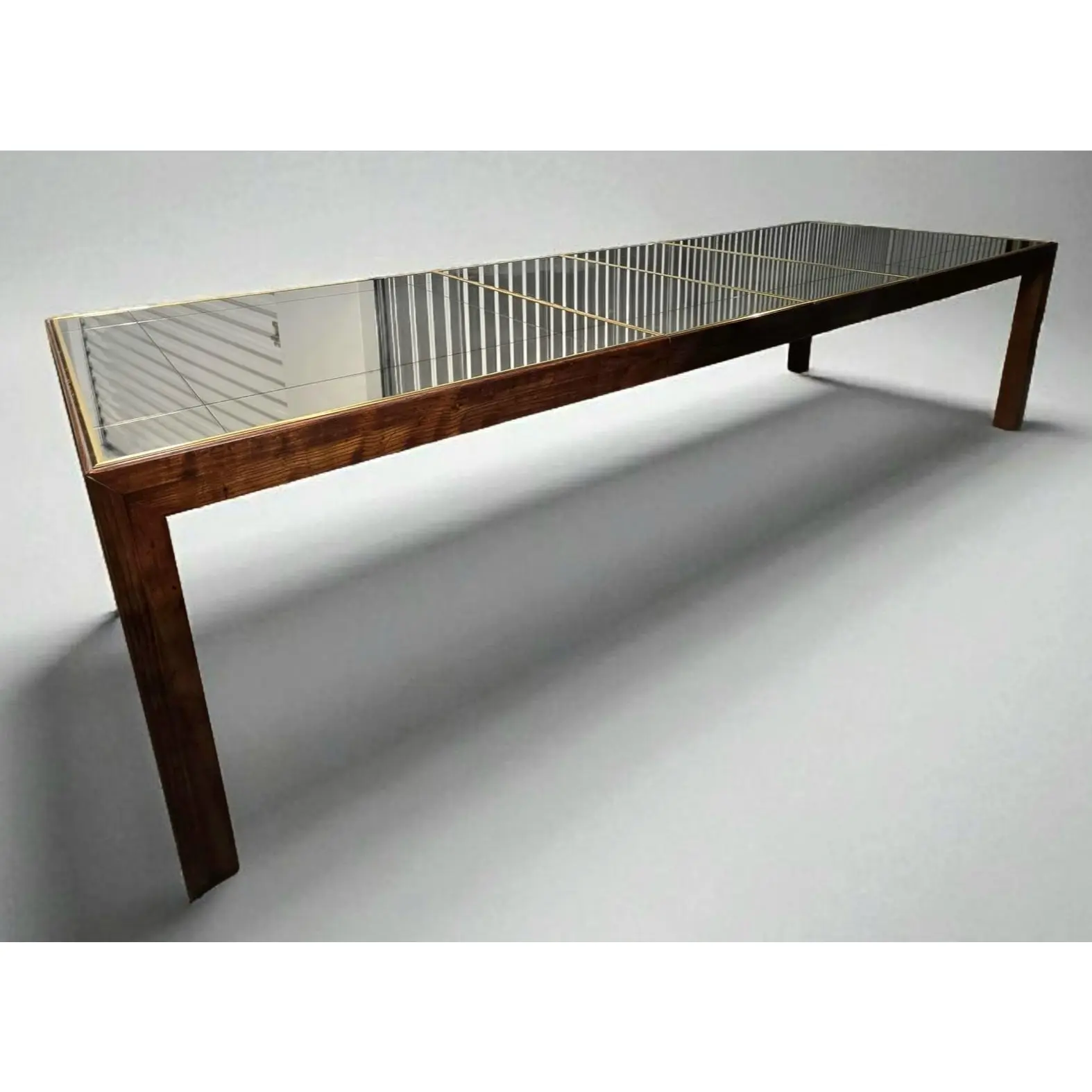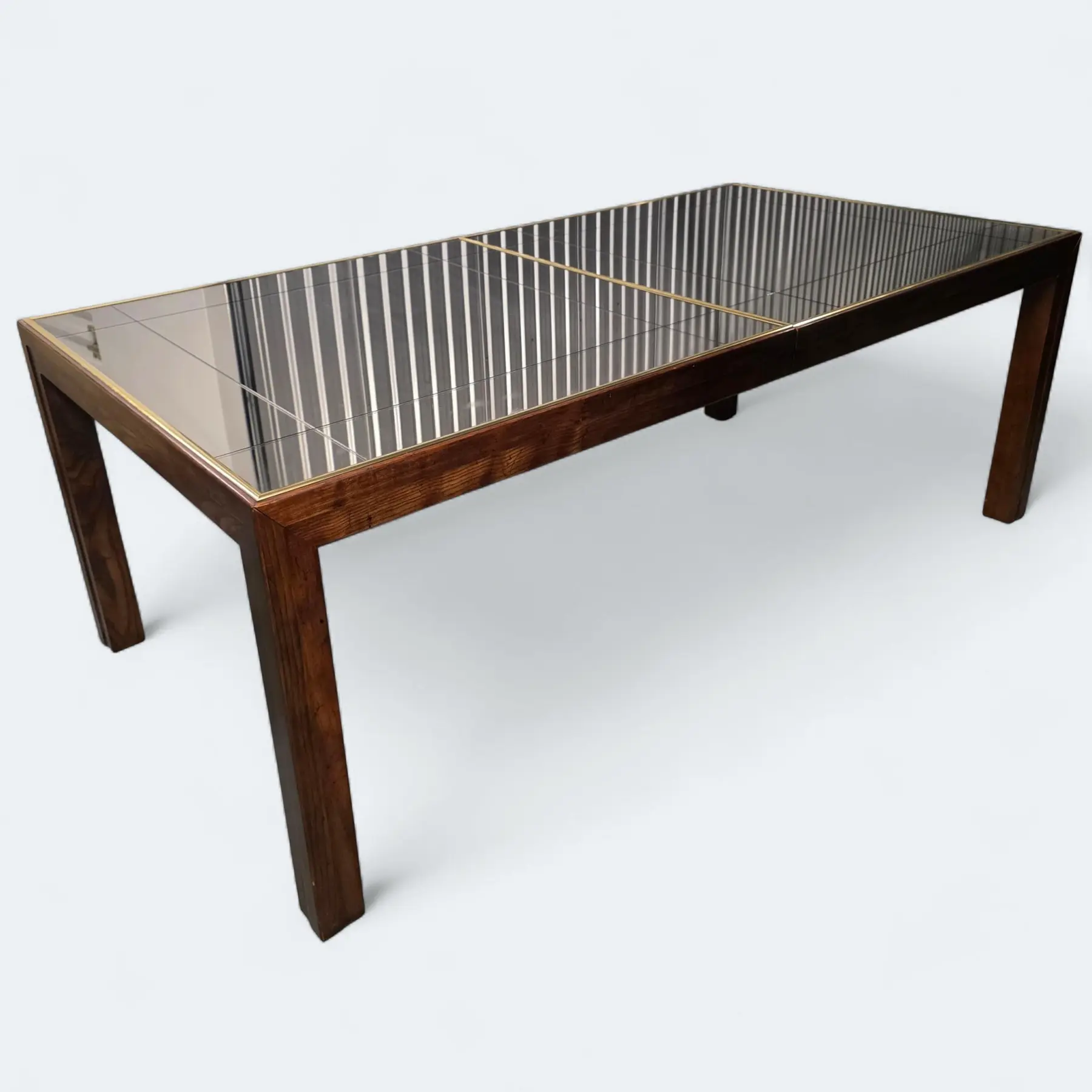 This Vintage Henredon Walnut, Brass Trim & Etched Smoked Mirror Parsons Dining Table with 2 Leaves is a bold and georgeous display of mid-century high-end design with a touch of Hollywood Regency flair, ready to anchor an inviting dining or other space.