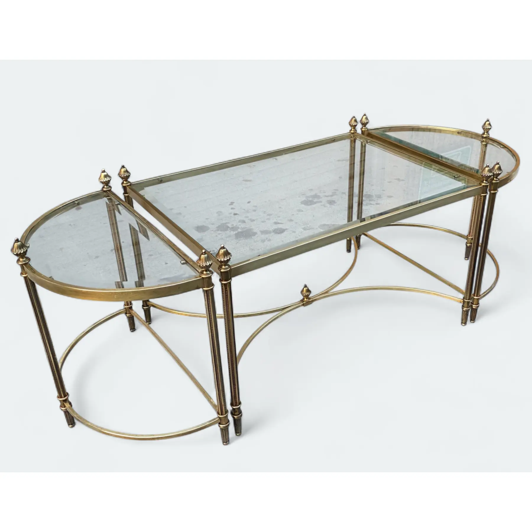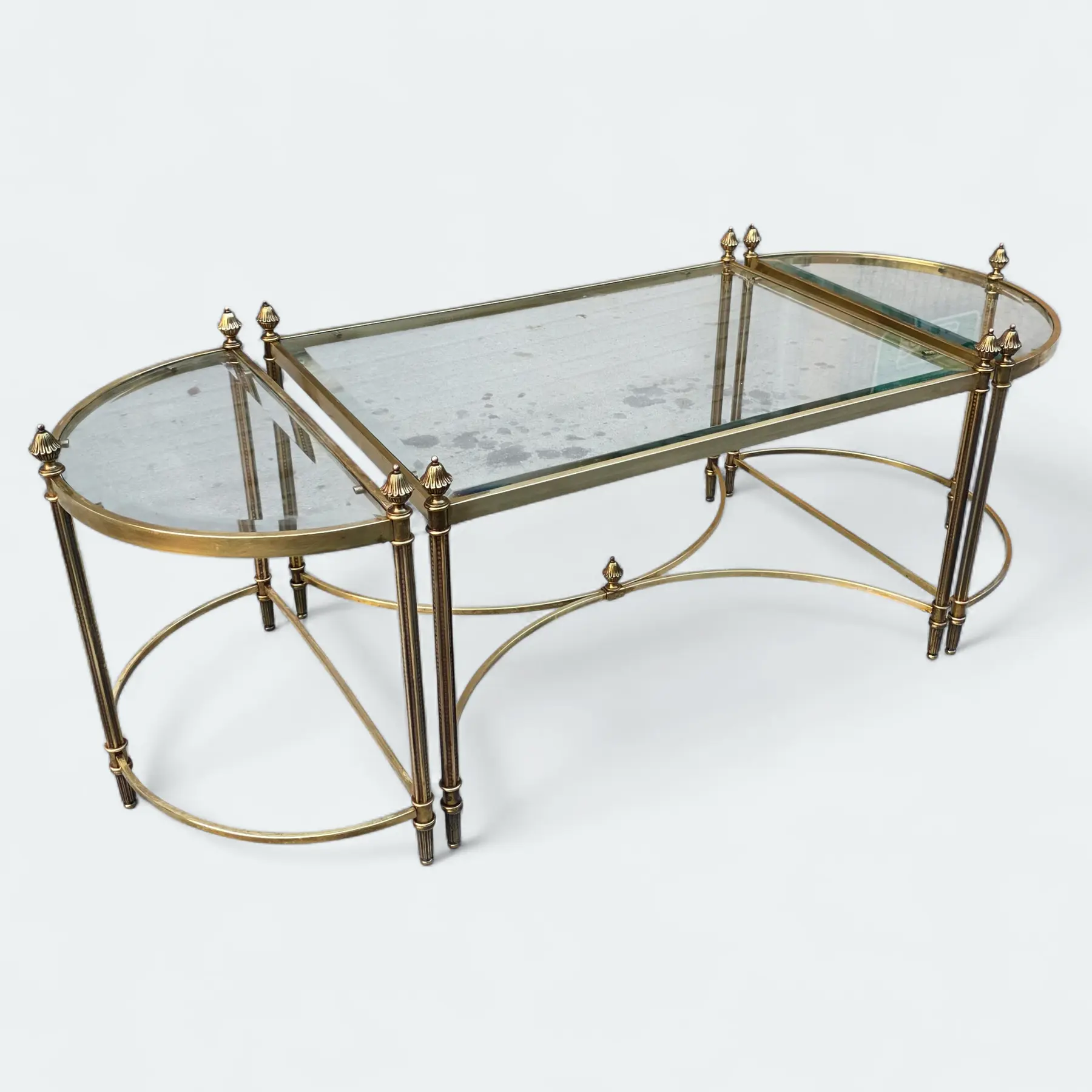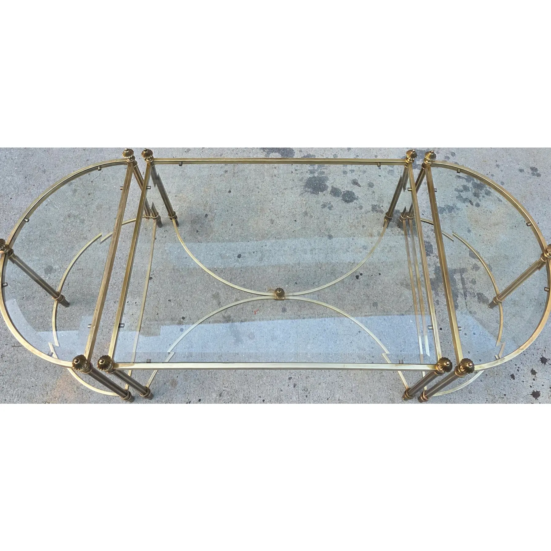 Elevate your living space with this glamorous Hollywood Regency coffee table featuring a gilt brass frame and inset glass top. The table showcases a striking neoclassical silhouette with demi-lune ends and a rectangular center panel, all detailed with decorative acorn finials at each corner.