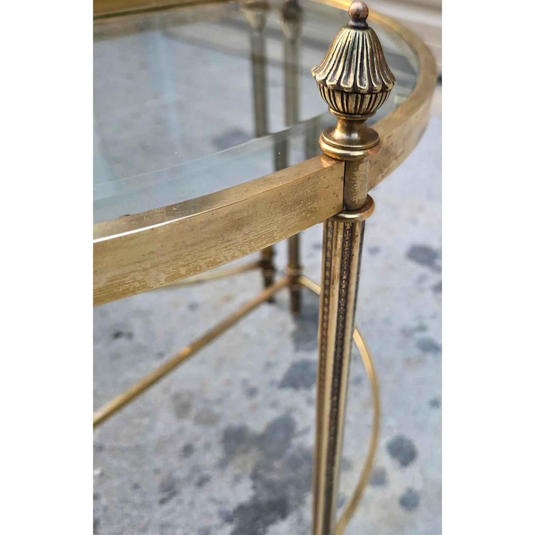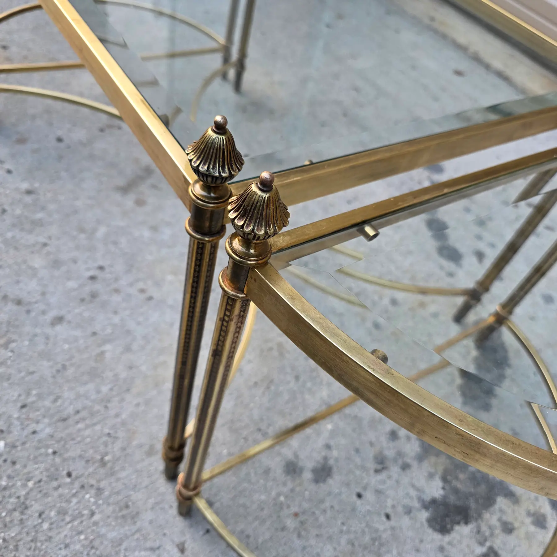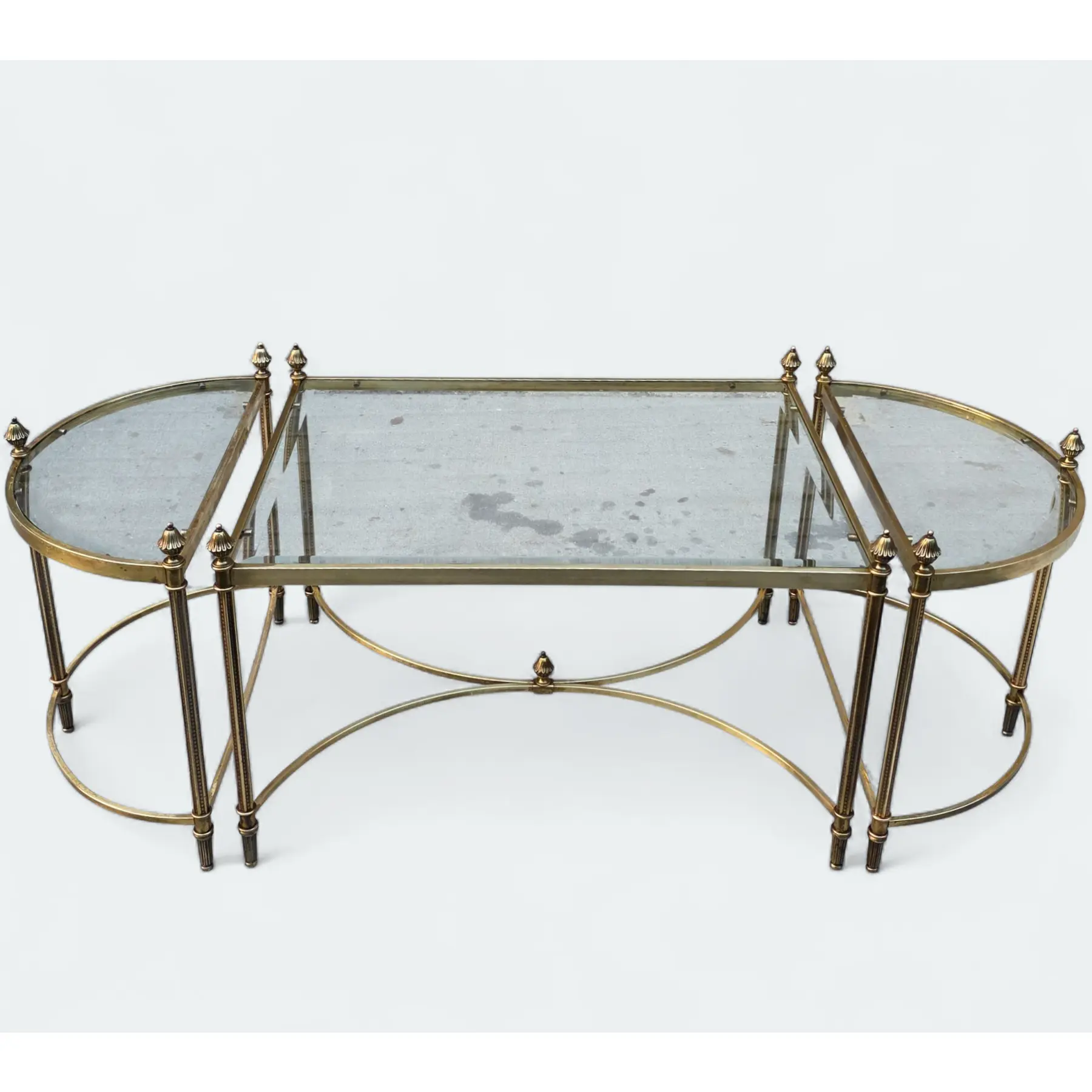 Elevate your living space with this glamorous Hollywood Regency coffee table featuring a gilt brass frame and inset glass top. The table showcases a striking neoclassical silhouette with demi-lune ends and a rectangular center panel, all detailed with decorative acorn finials at each corner.