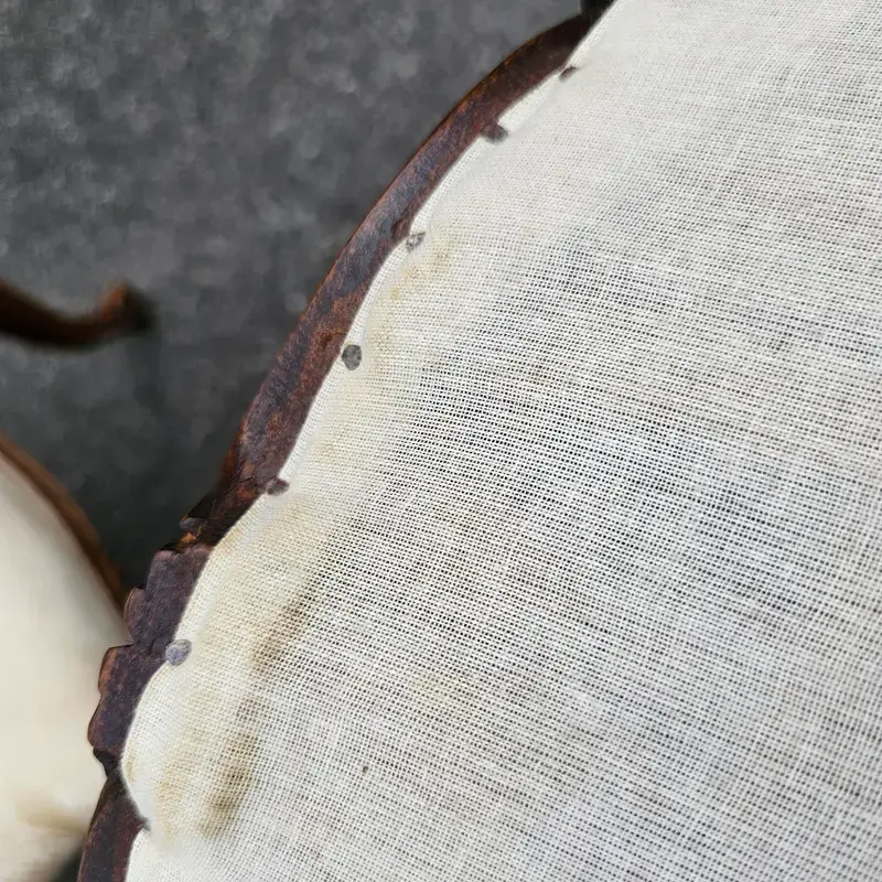 Cabriole legs and stylised acanthus flourishes at the knees, crest rails and seat aprons.