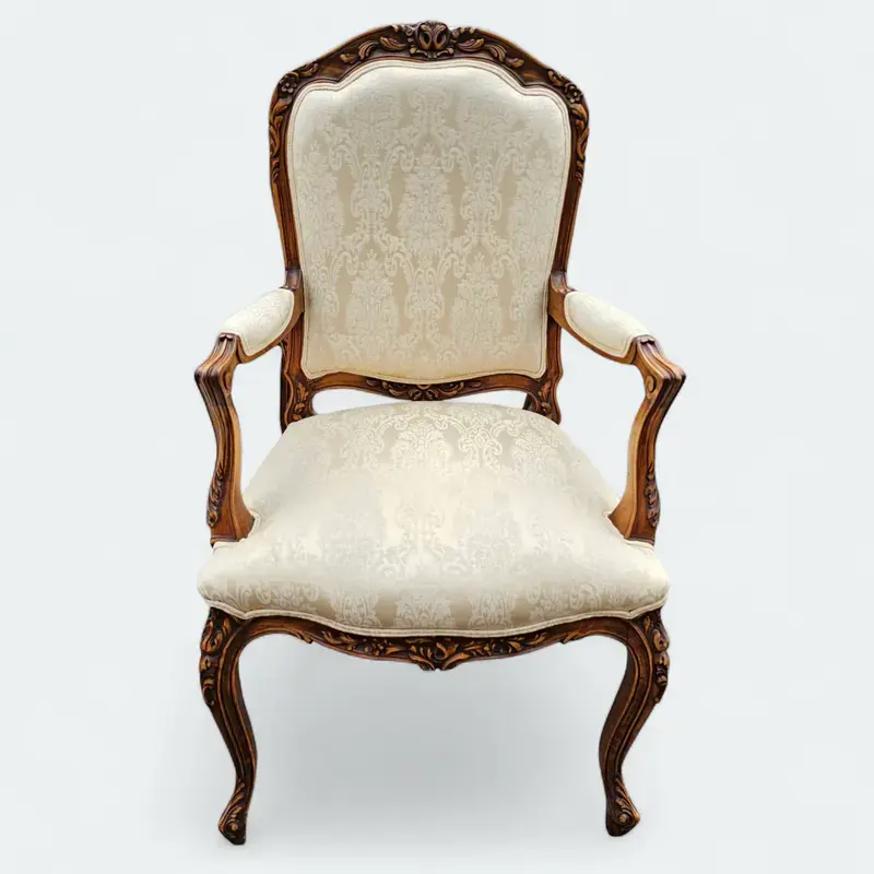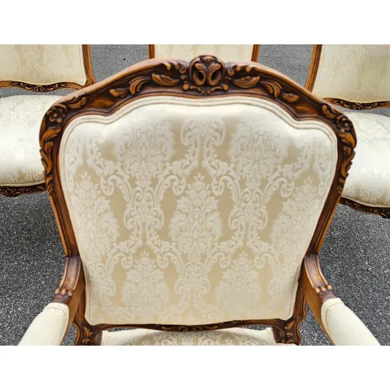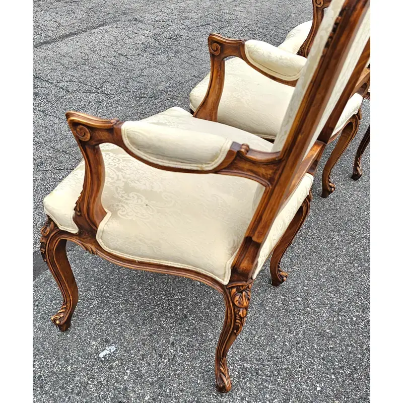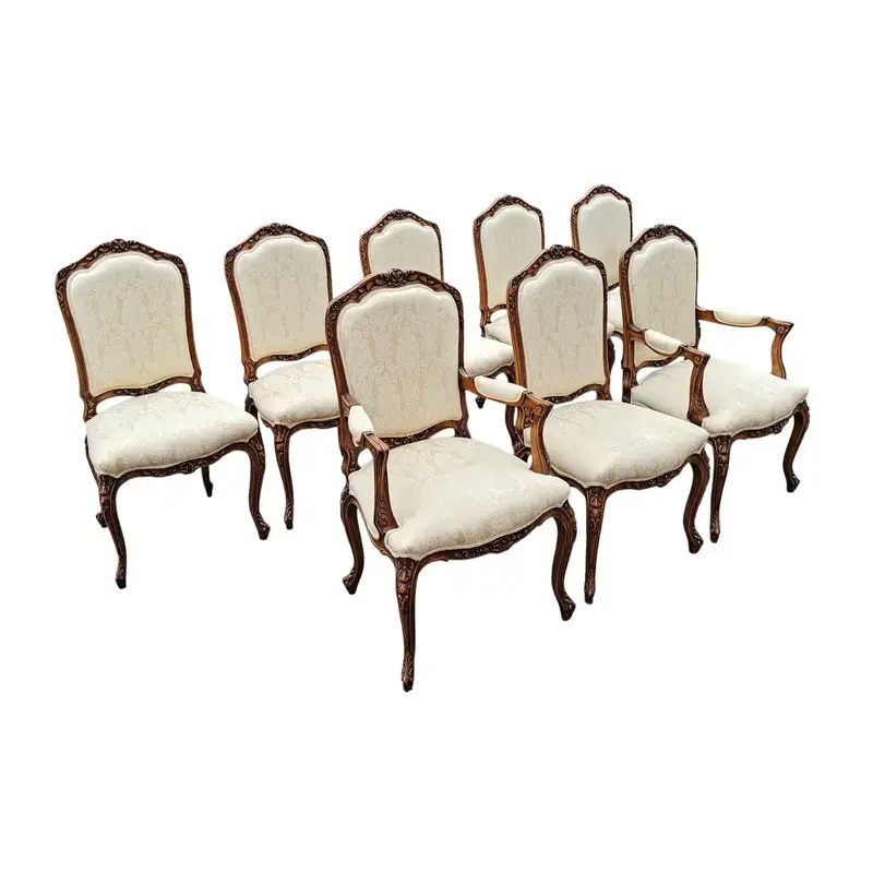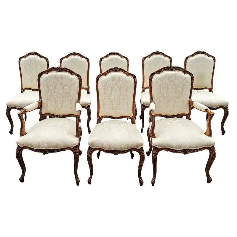 This Vintage Set of 8 Carved Custom Louis XV Style Dining Chairs has the presence distinguished enough for a cultivated dining room or space.