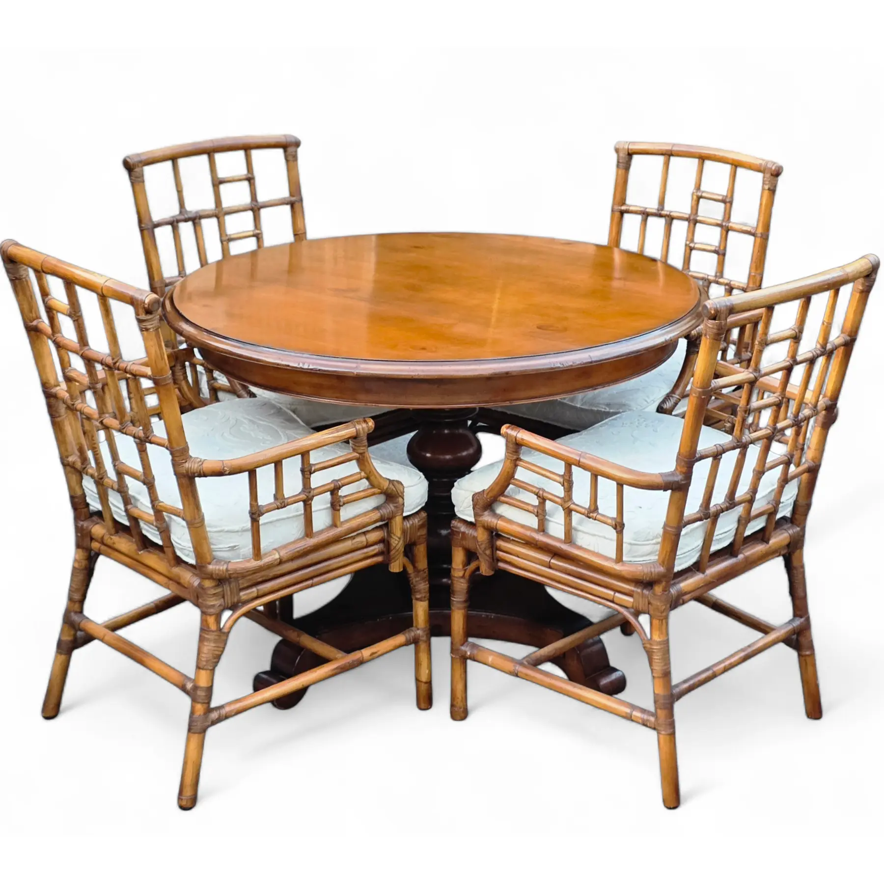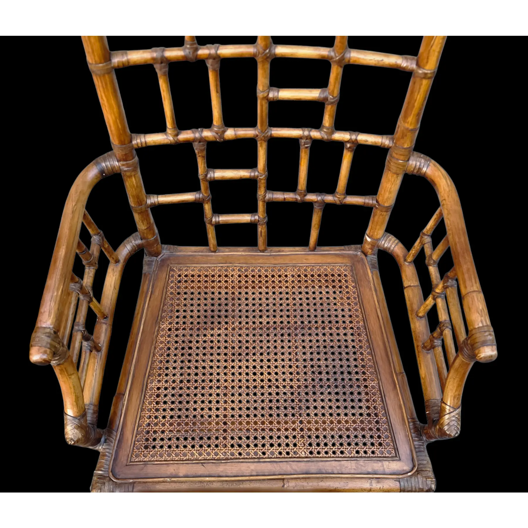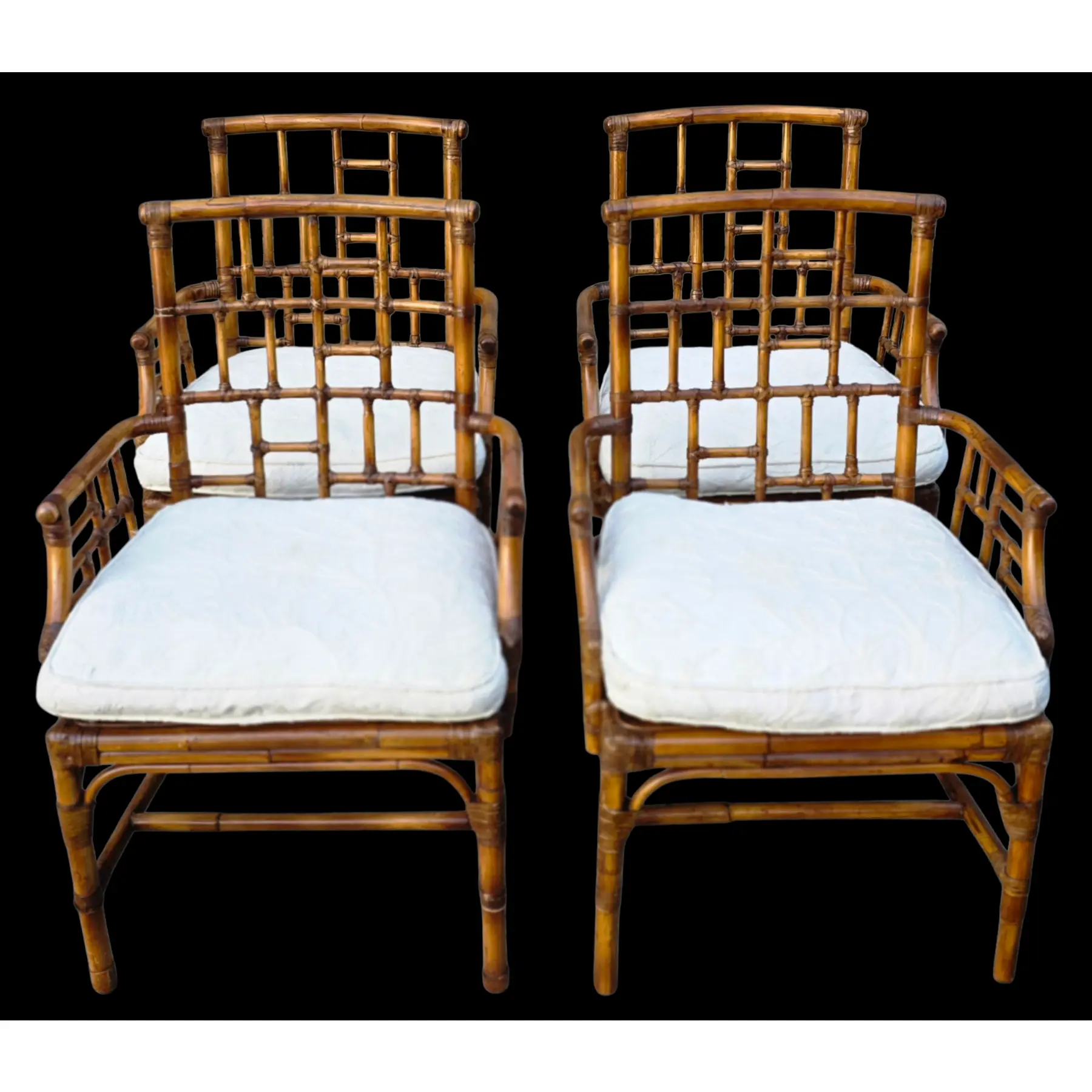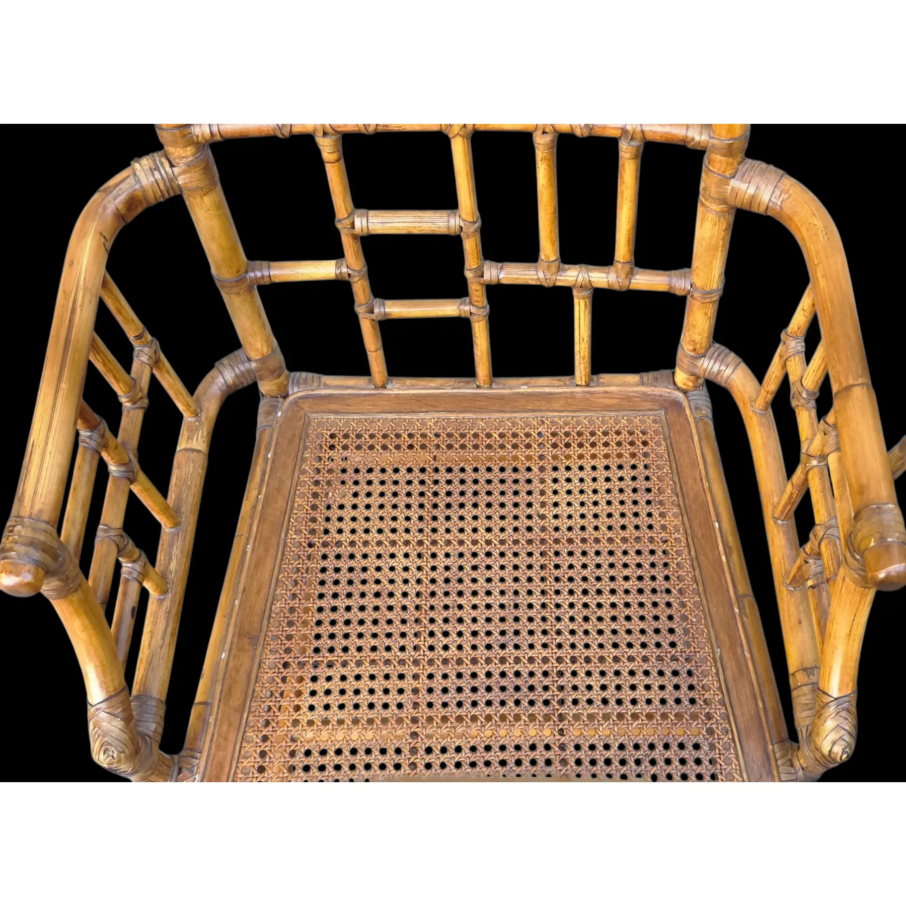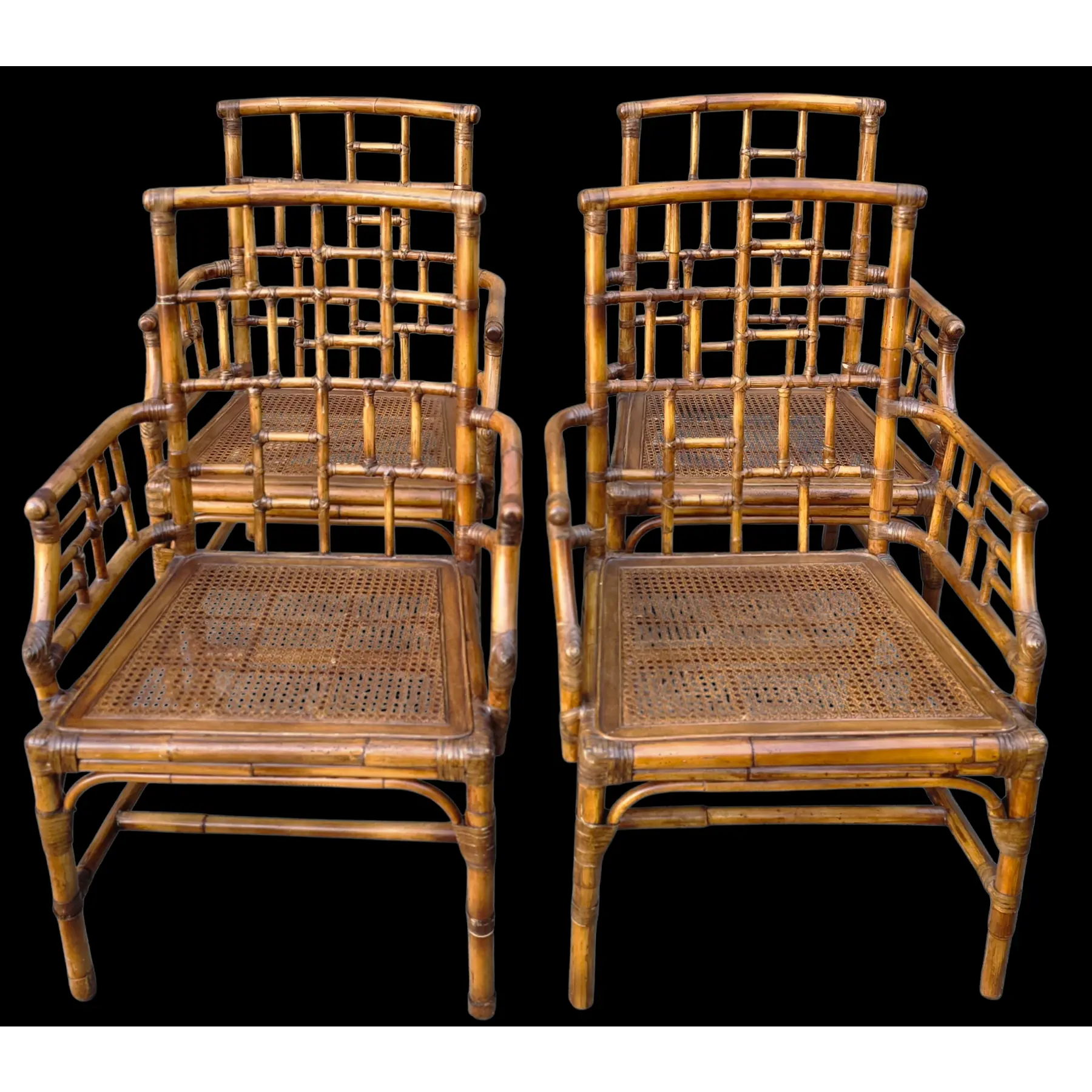 Good vintage condition with surface wear consistent with age and use, including scattered scuffs, finish rubs and minor abrasions along bamboo edges, joints, arms, and legs. Cane seating shows areas of tonal variation, light wear and subtle darkening in places consistent with natural aging. Overall, set is well-preserved and structurally sound.