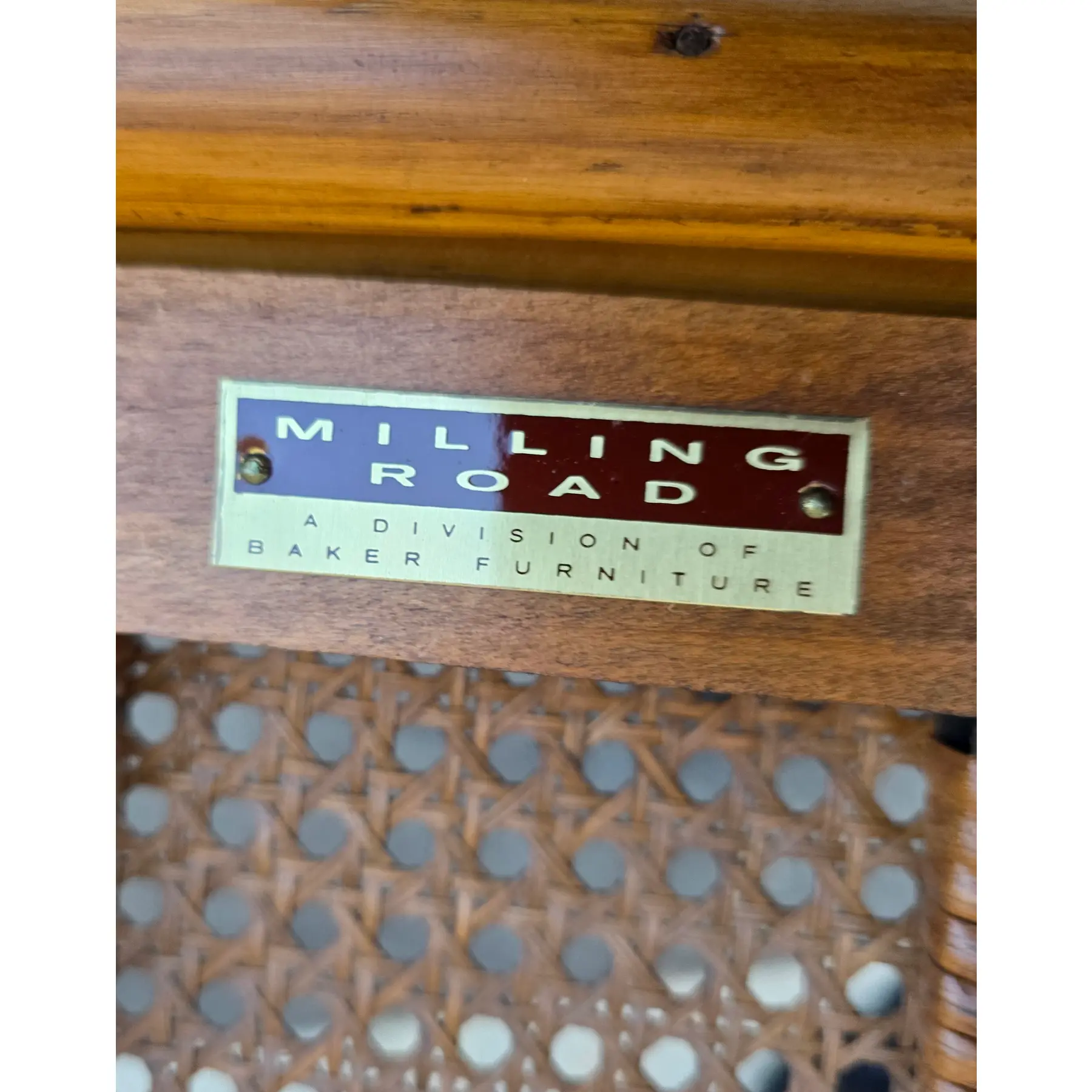 Milling Road by Baker Furniture, metal label visible and affixed to wooden support beneath seat on one of the chairs