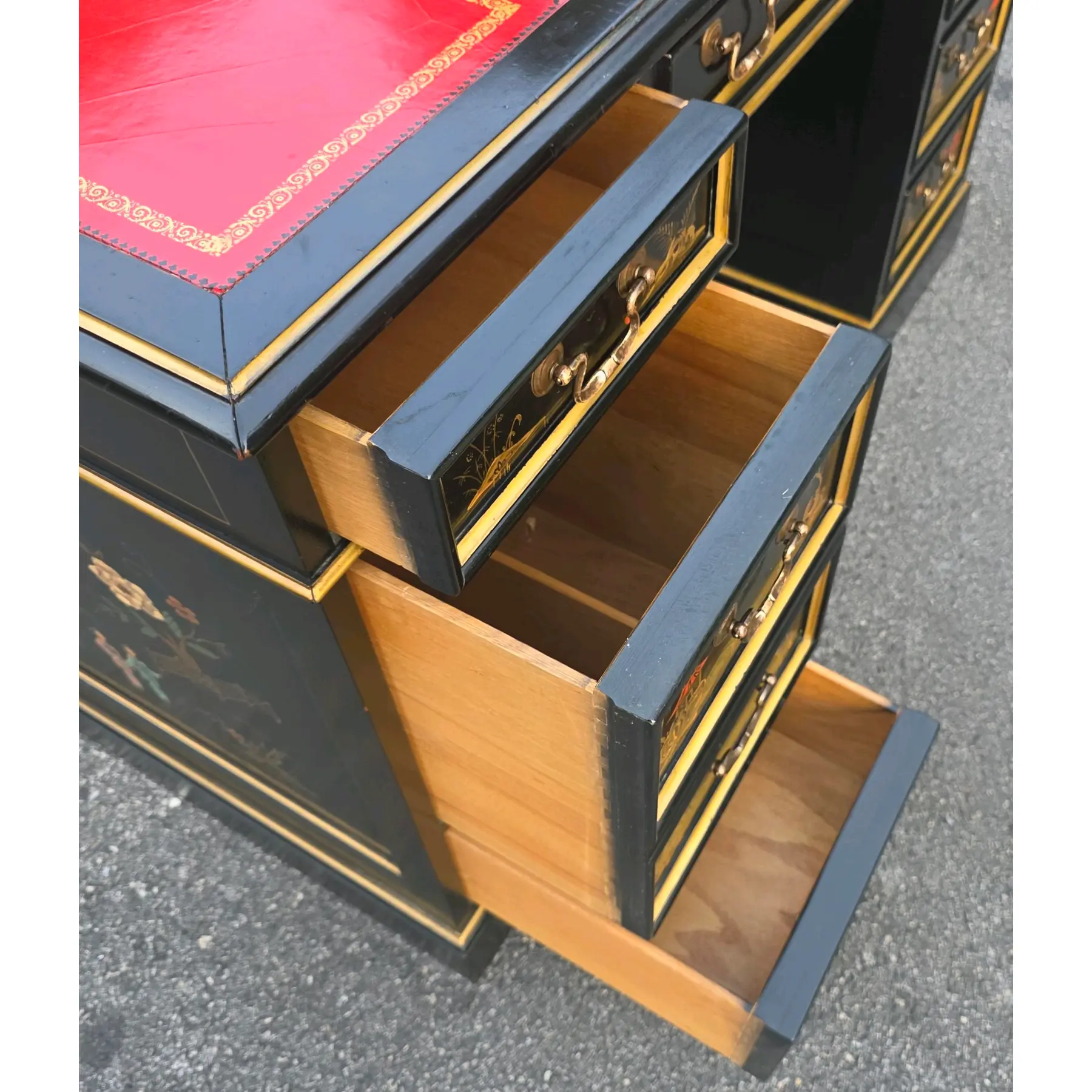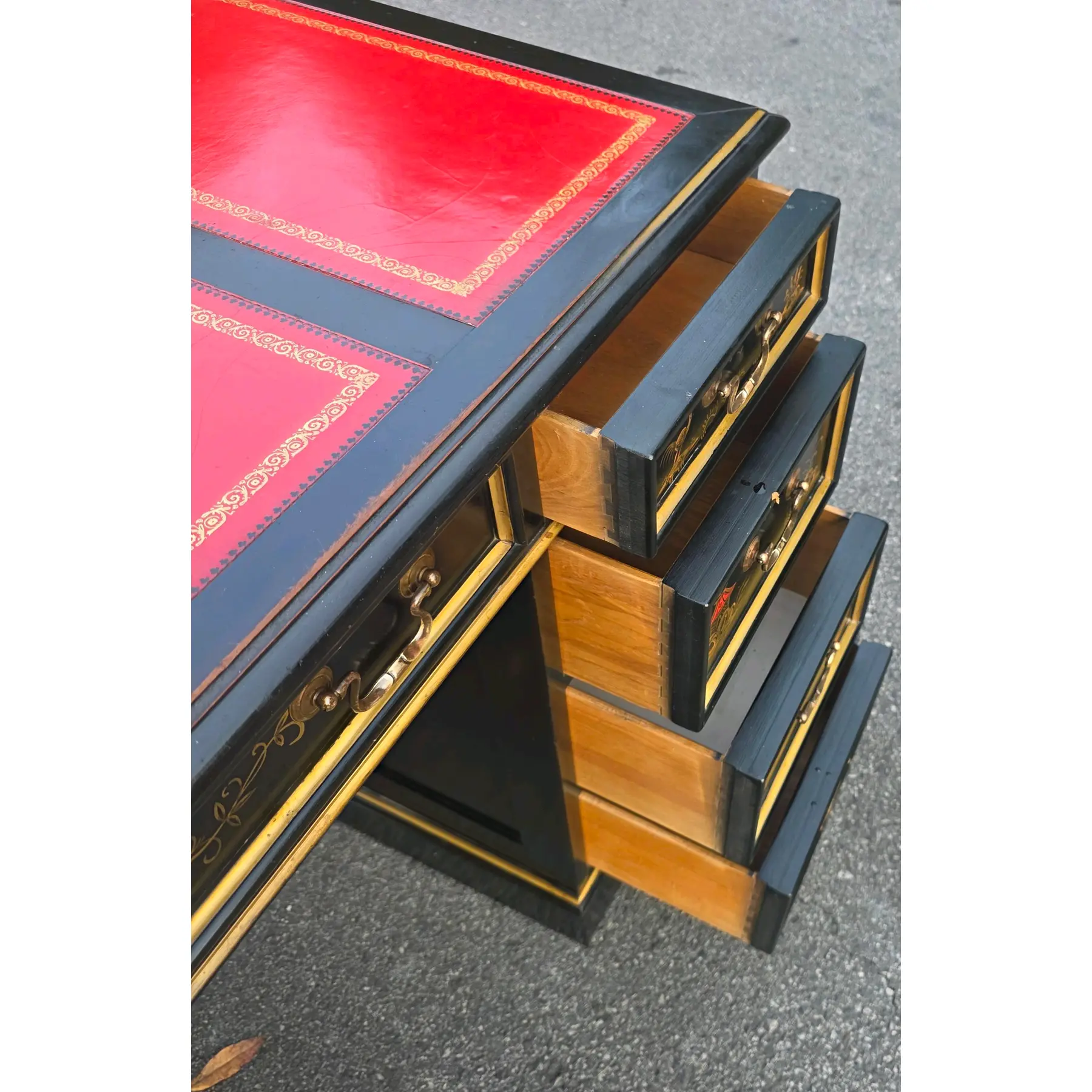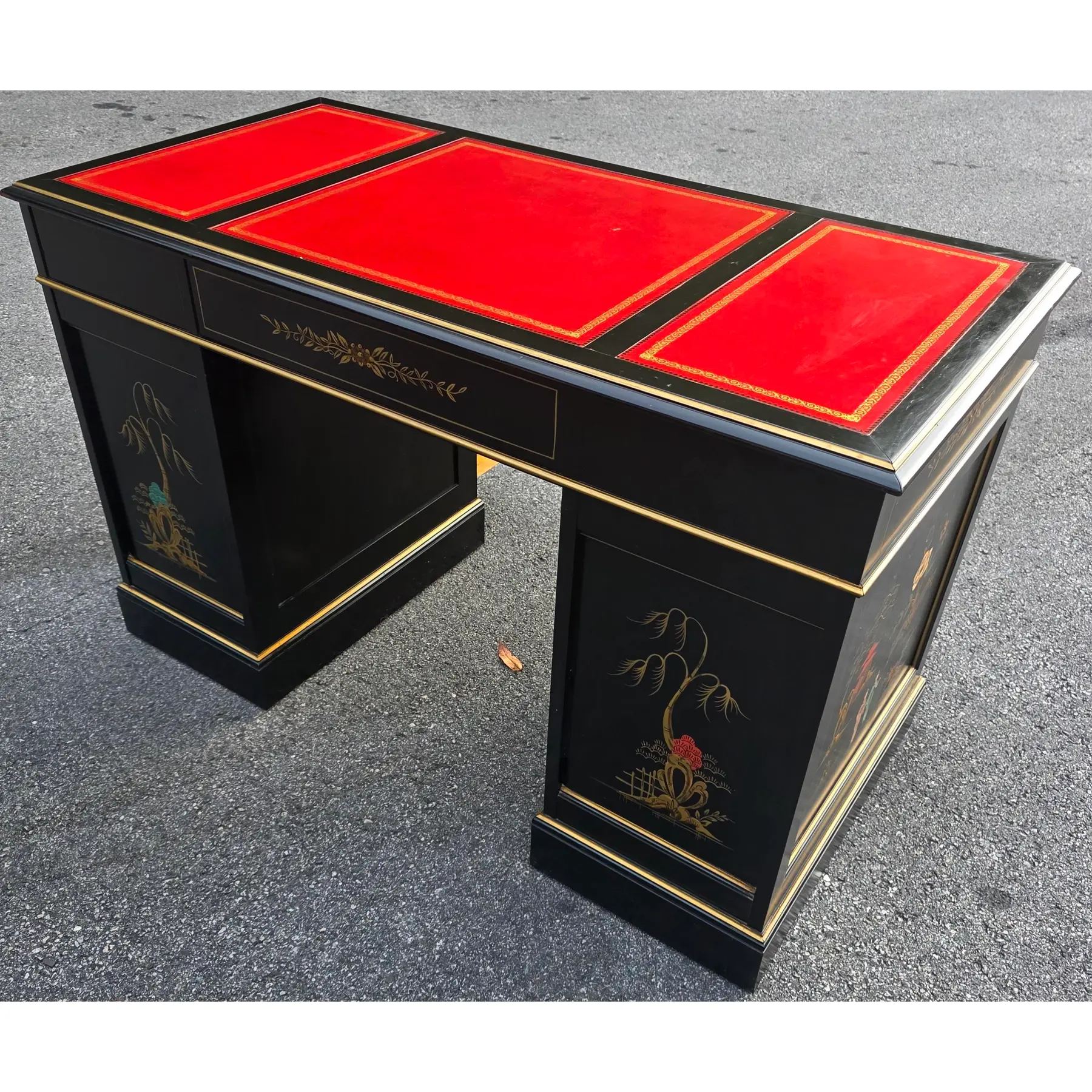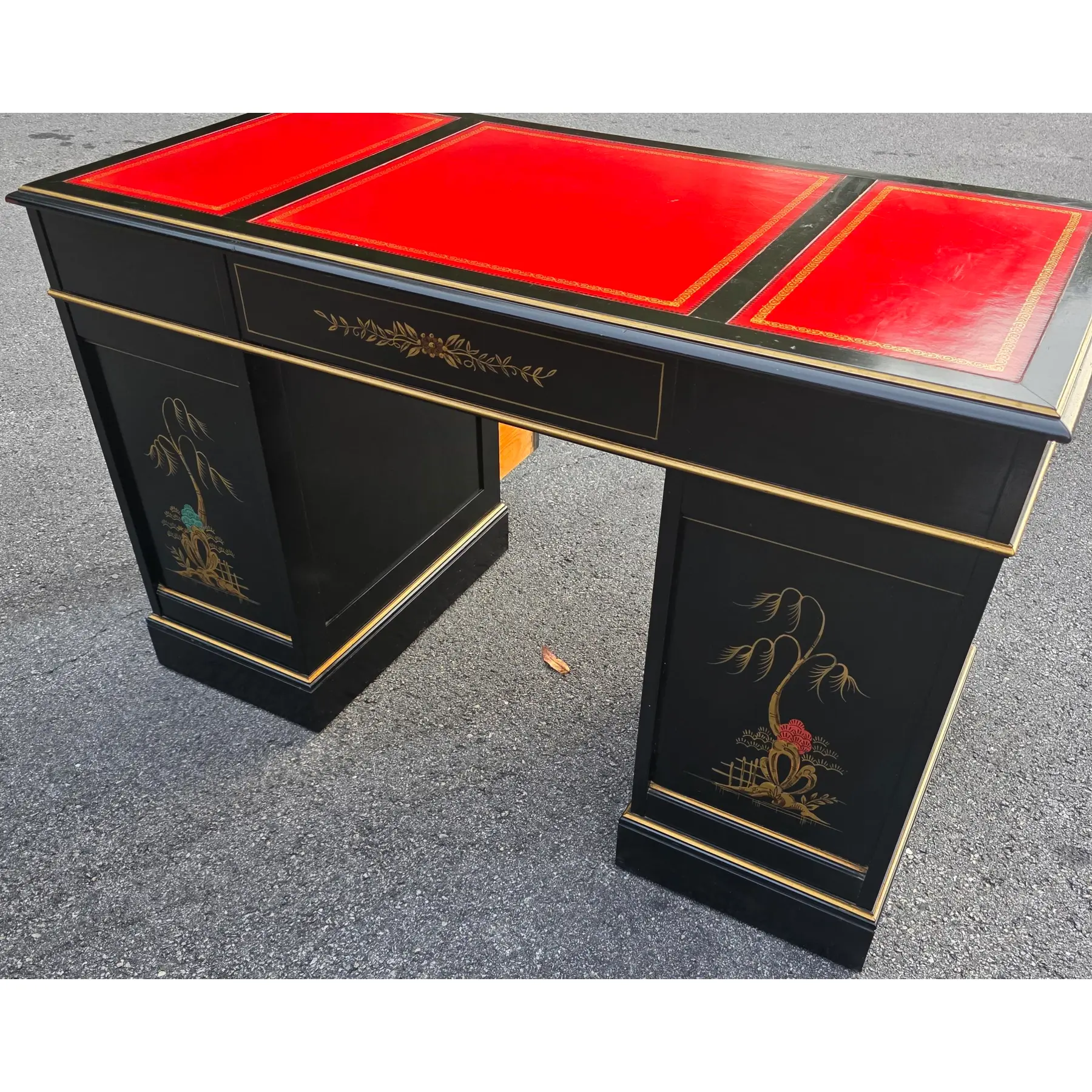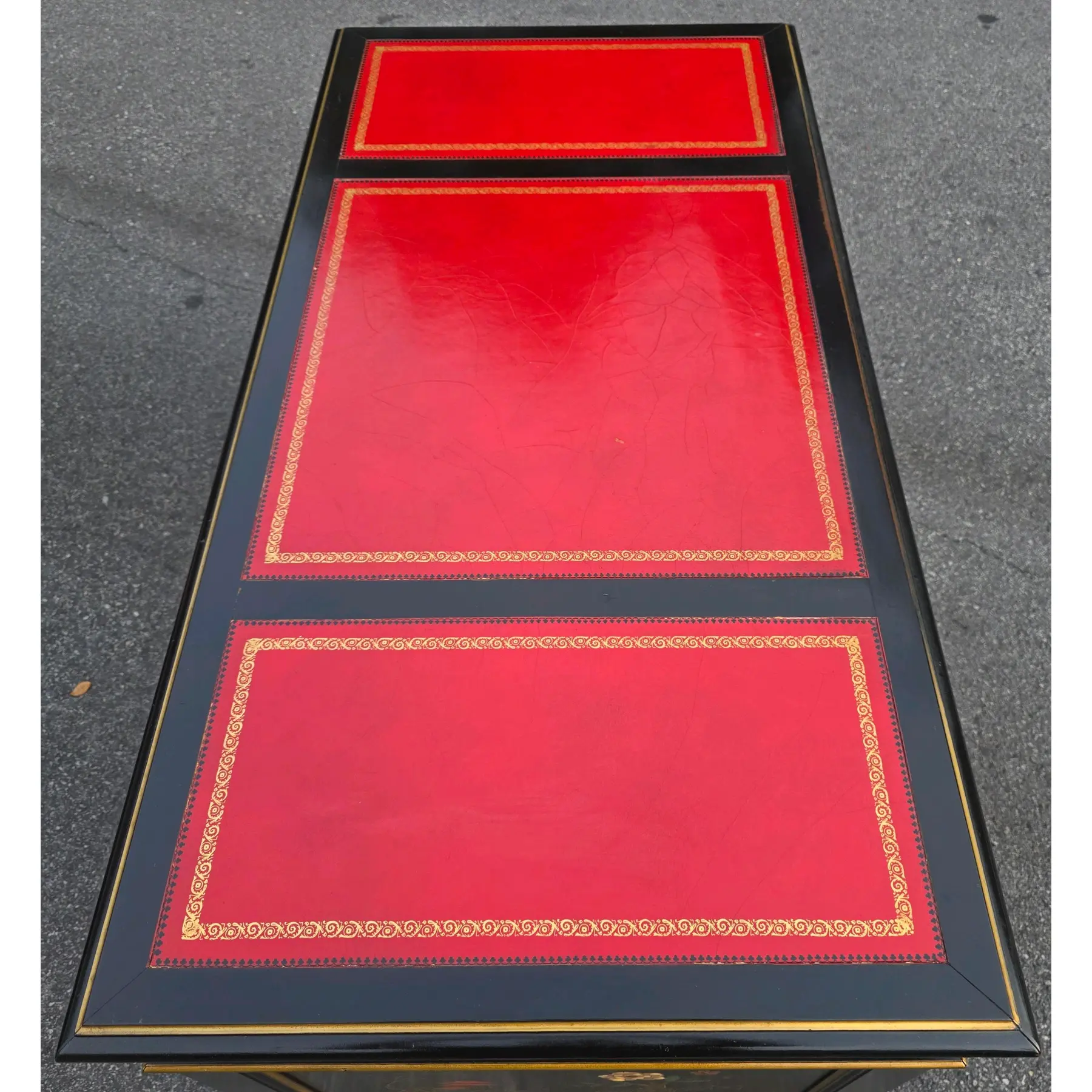 This is a beautifully preserved vintage desk that is sturdy and highly usable. The black laquer finish shows light wear along the edges and corners, commensurate with age. The read leather top has age-consistent minor fading, craqueture, and small surface marks
