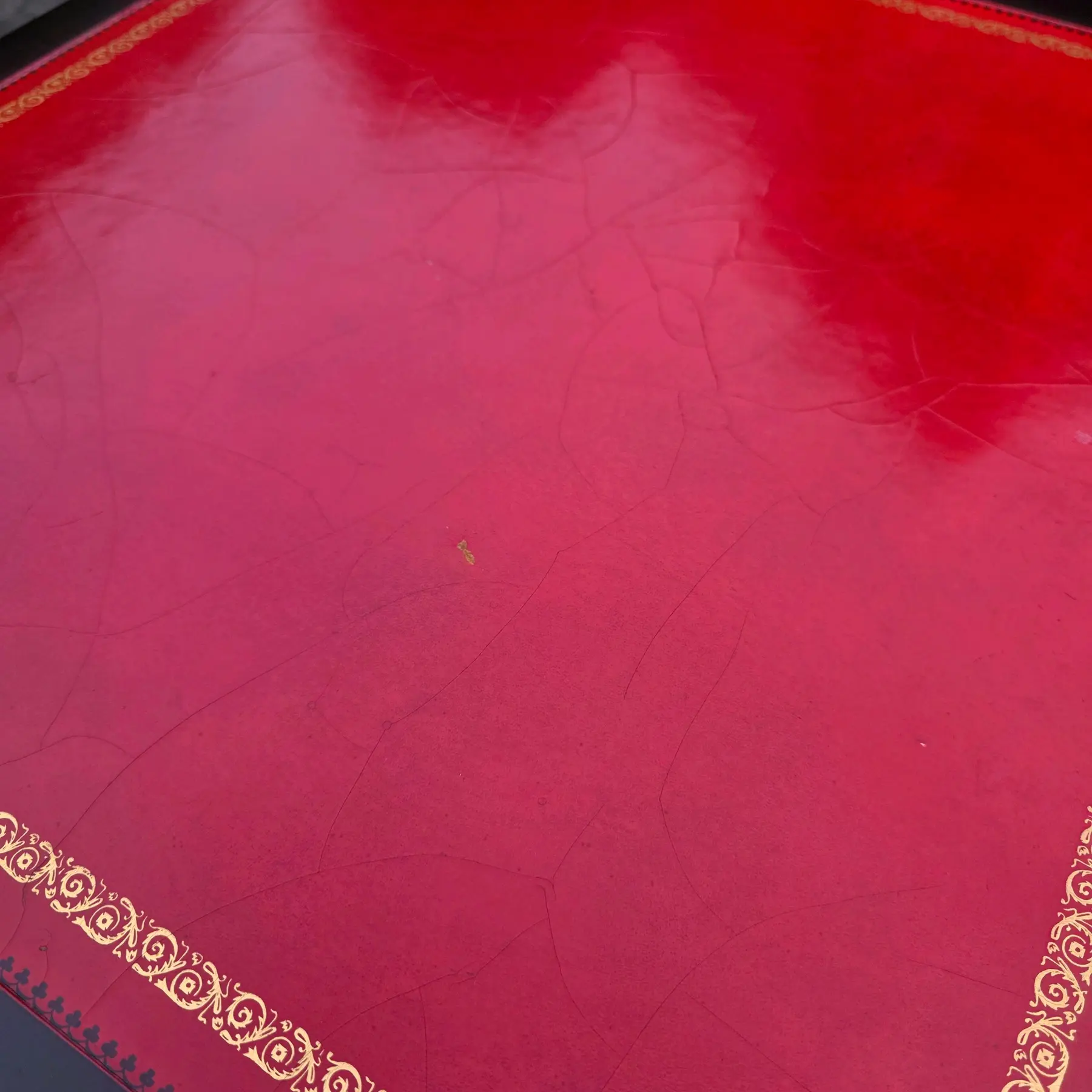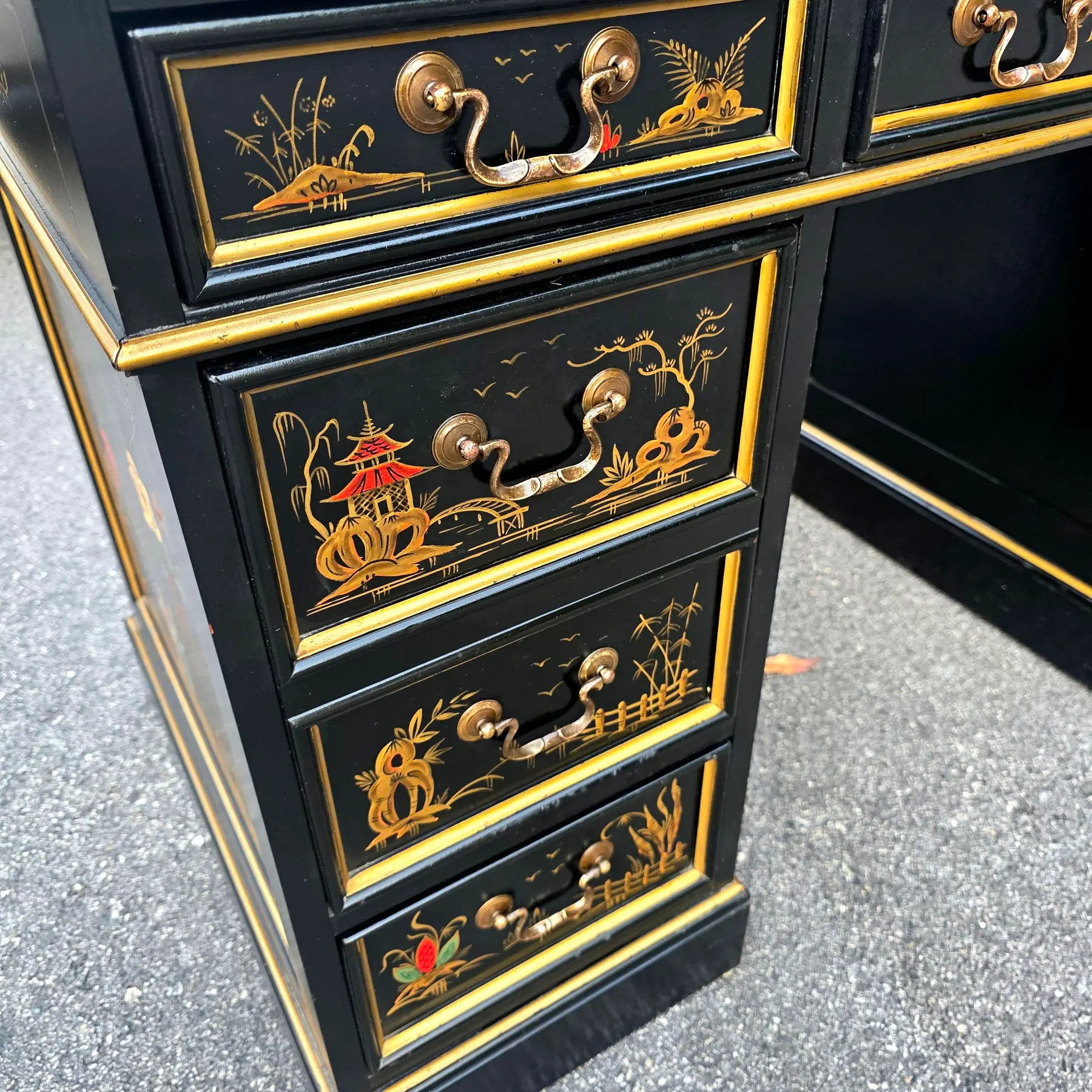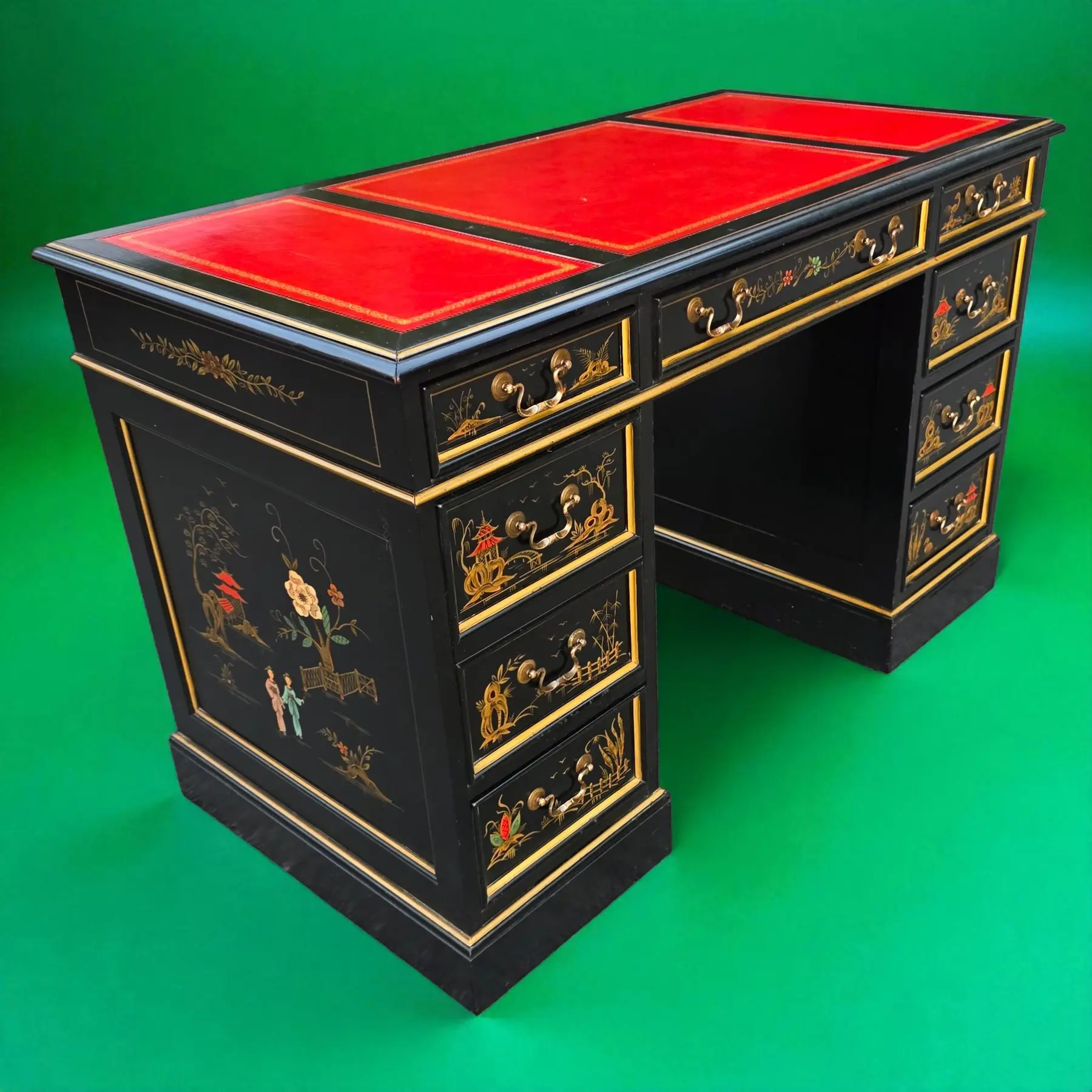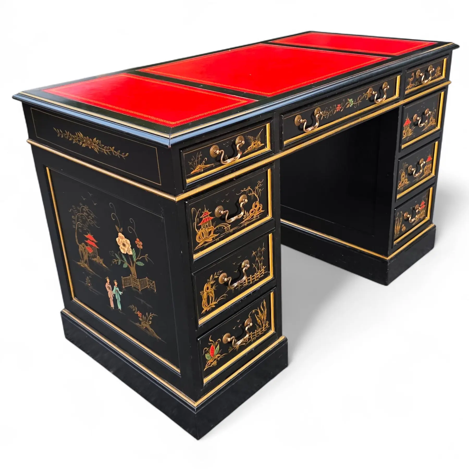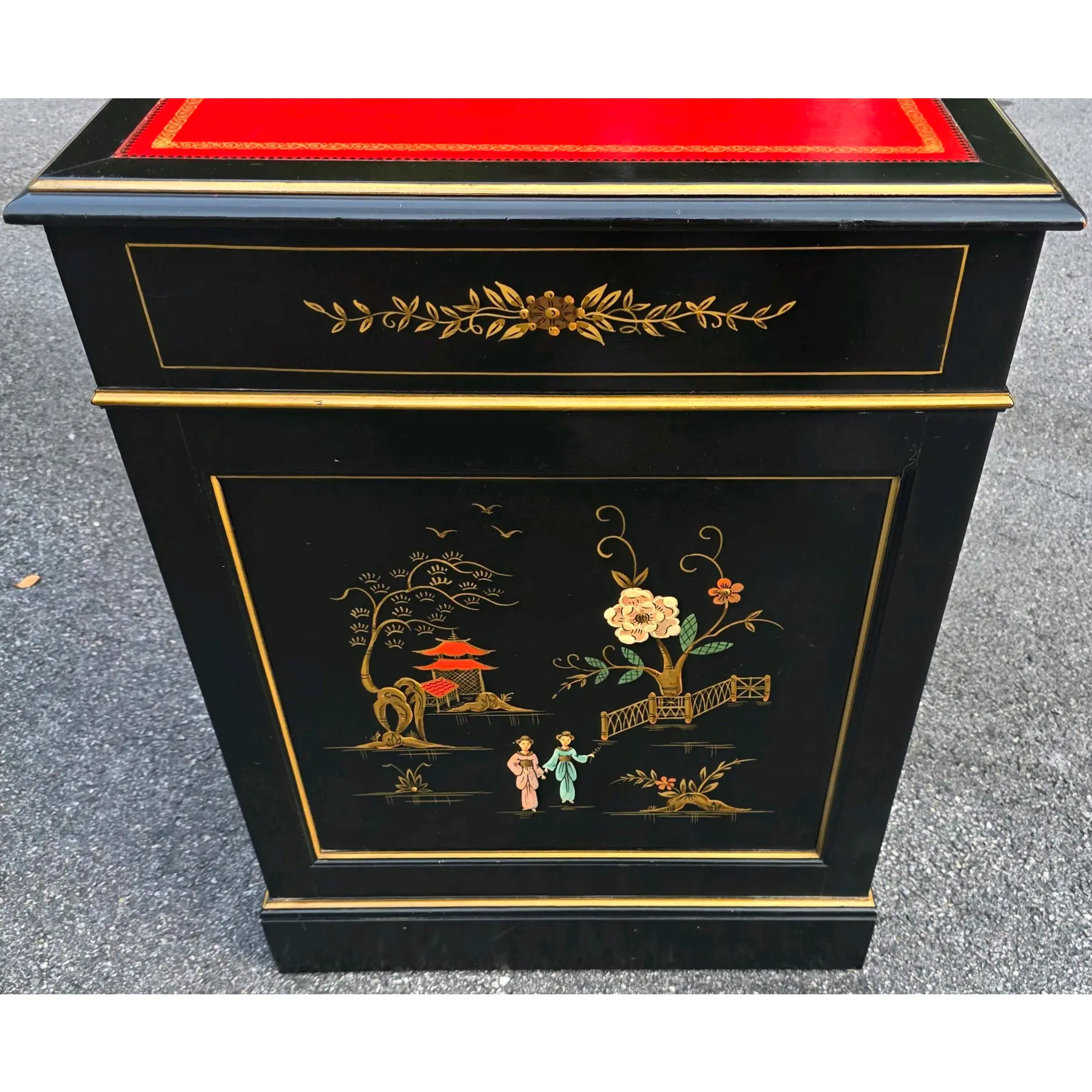 This is a beautifully preserved vintage desk that is sturdy and highly usable. The black laquer finish shows light wear along the edges and corners, commensurate with age. The read leather top has age-consistent minor fading, craqueture, and small surface marks