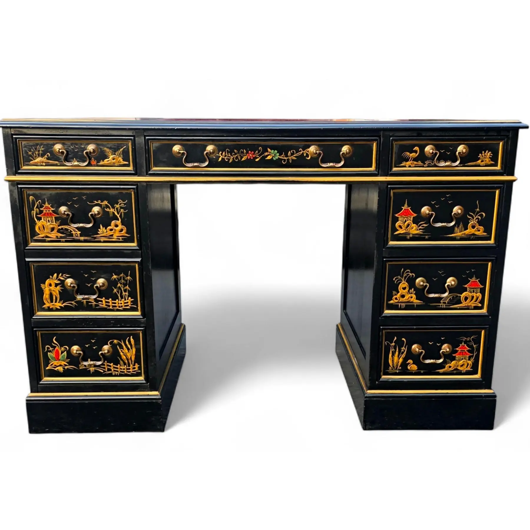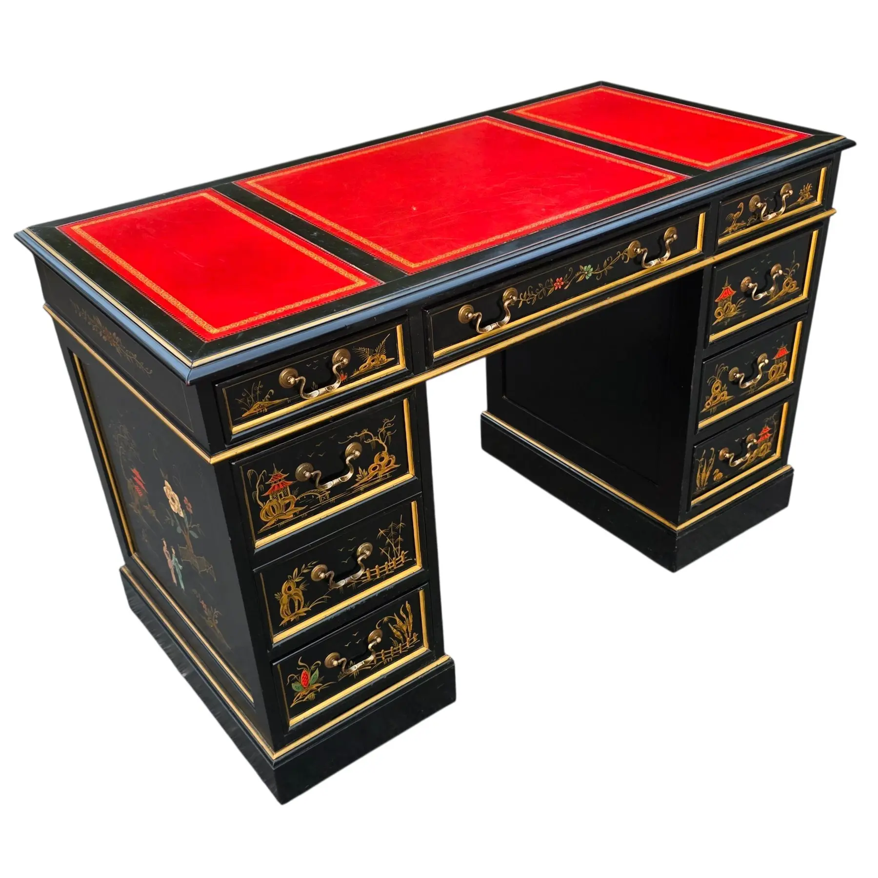 This Vintage Sligh-Lowry Chinoiserie Kneehole Writing Desk with Red Tooled Leather Top is a rare and commanding piece with vintage character and lots of ornamentation, ready to grace a library, study, or other design-forward interior.